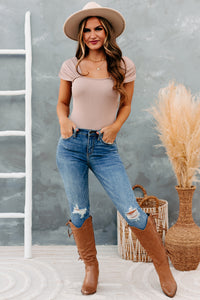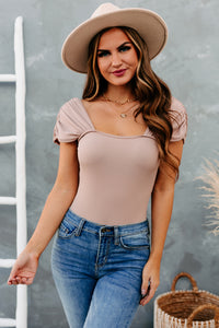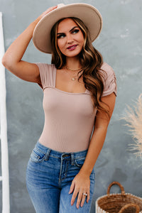 Simplicity Is Key With This Mocha, Ribbed, Ruched Strap Bodysuit!