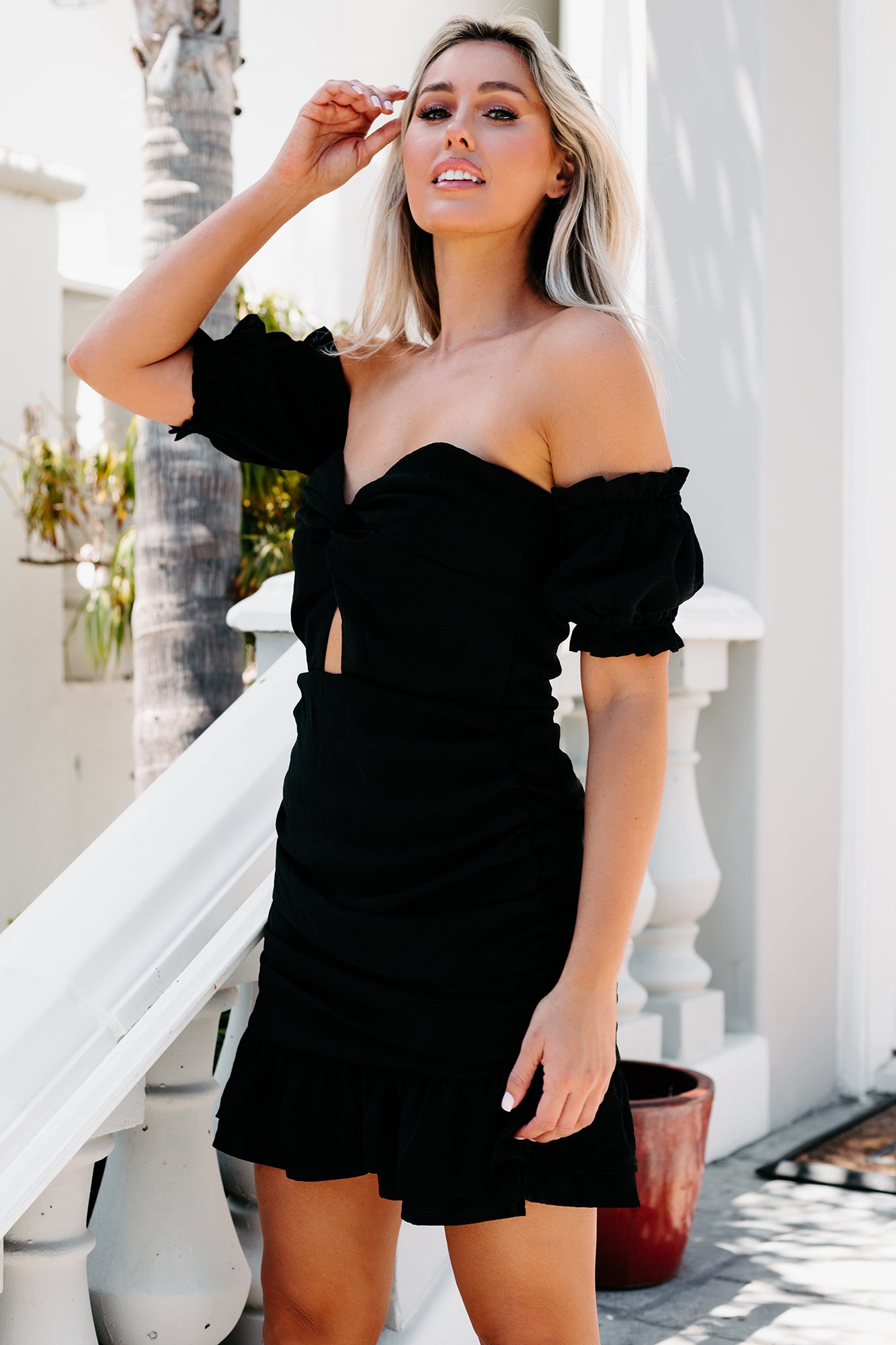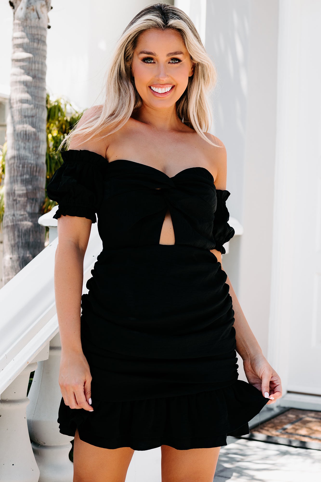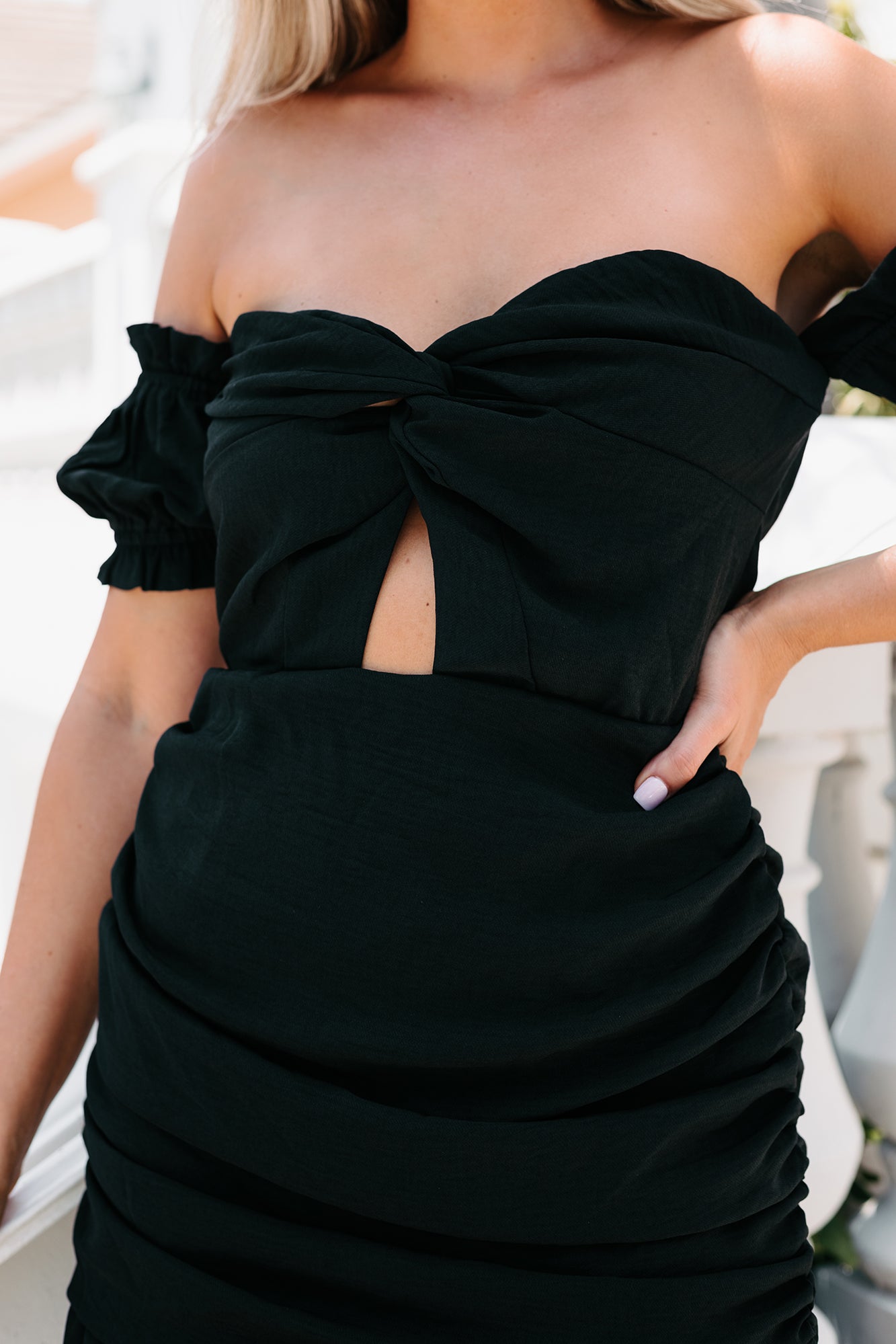 Make Em' Look With This Black, Off The Shoulder, Twist Knot, Front Cut-Out, Ruched, Mini Dress!