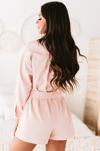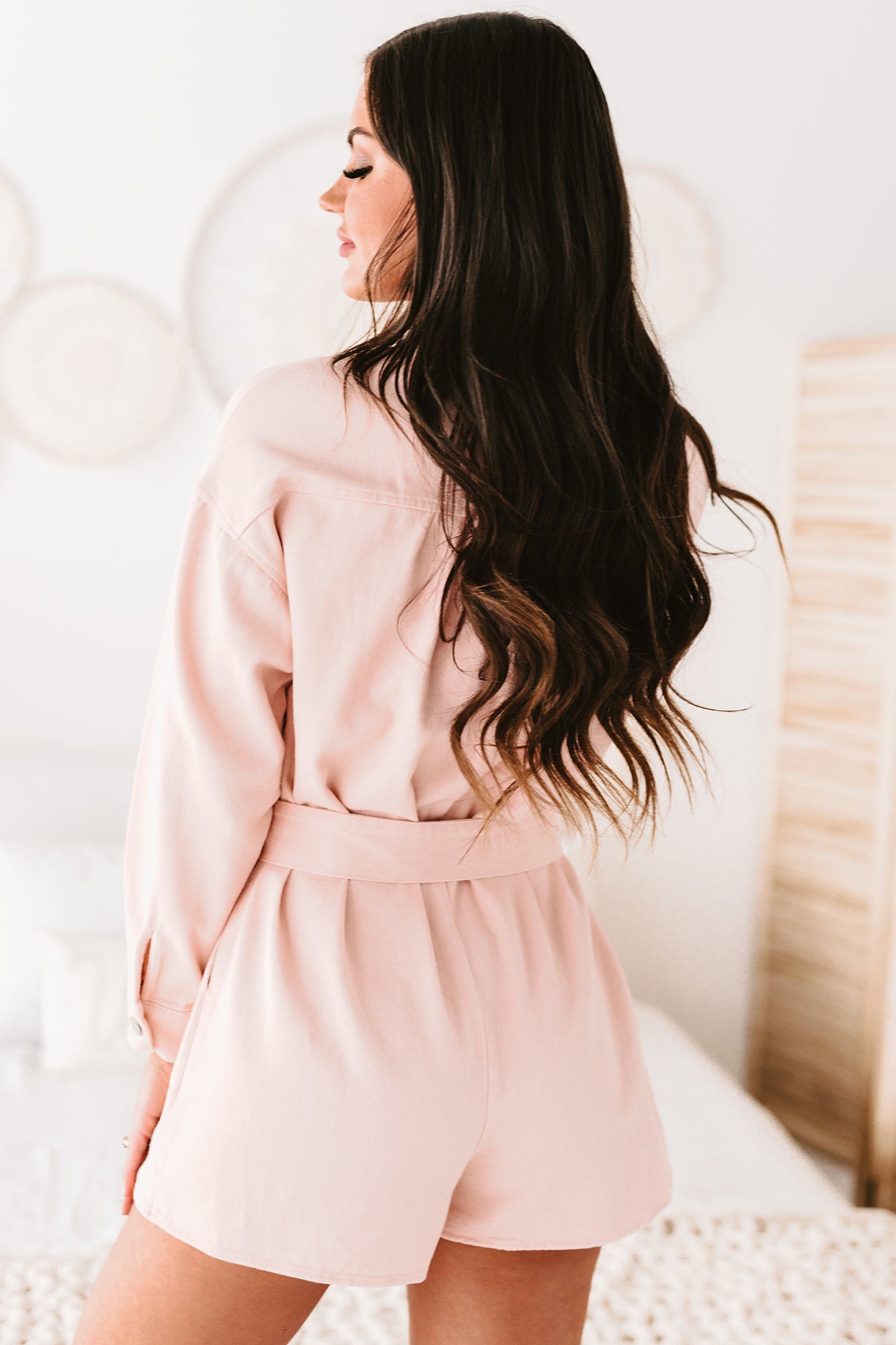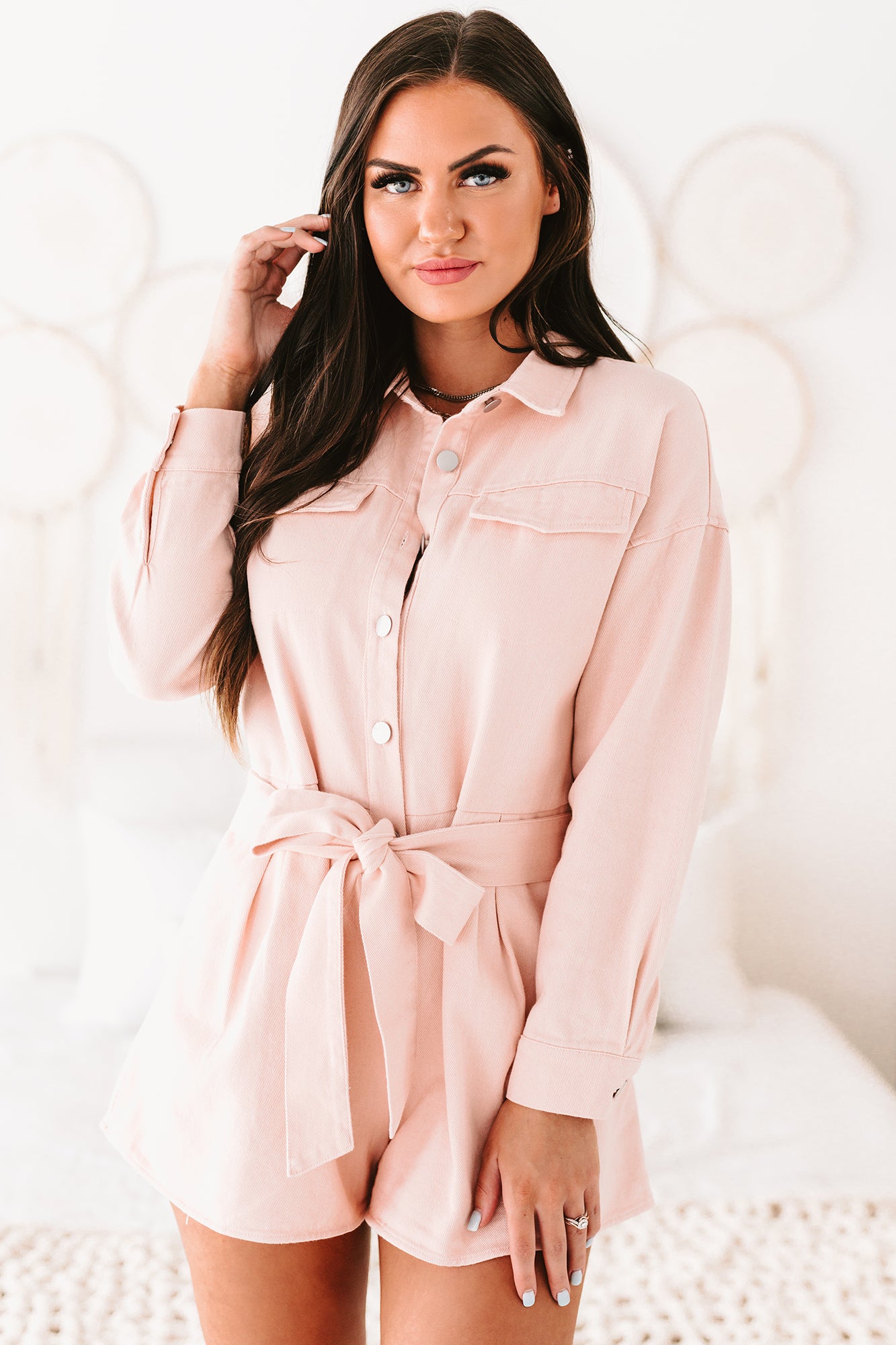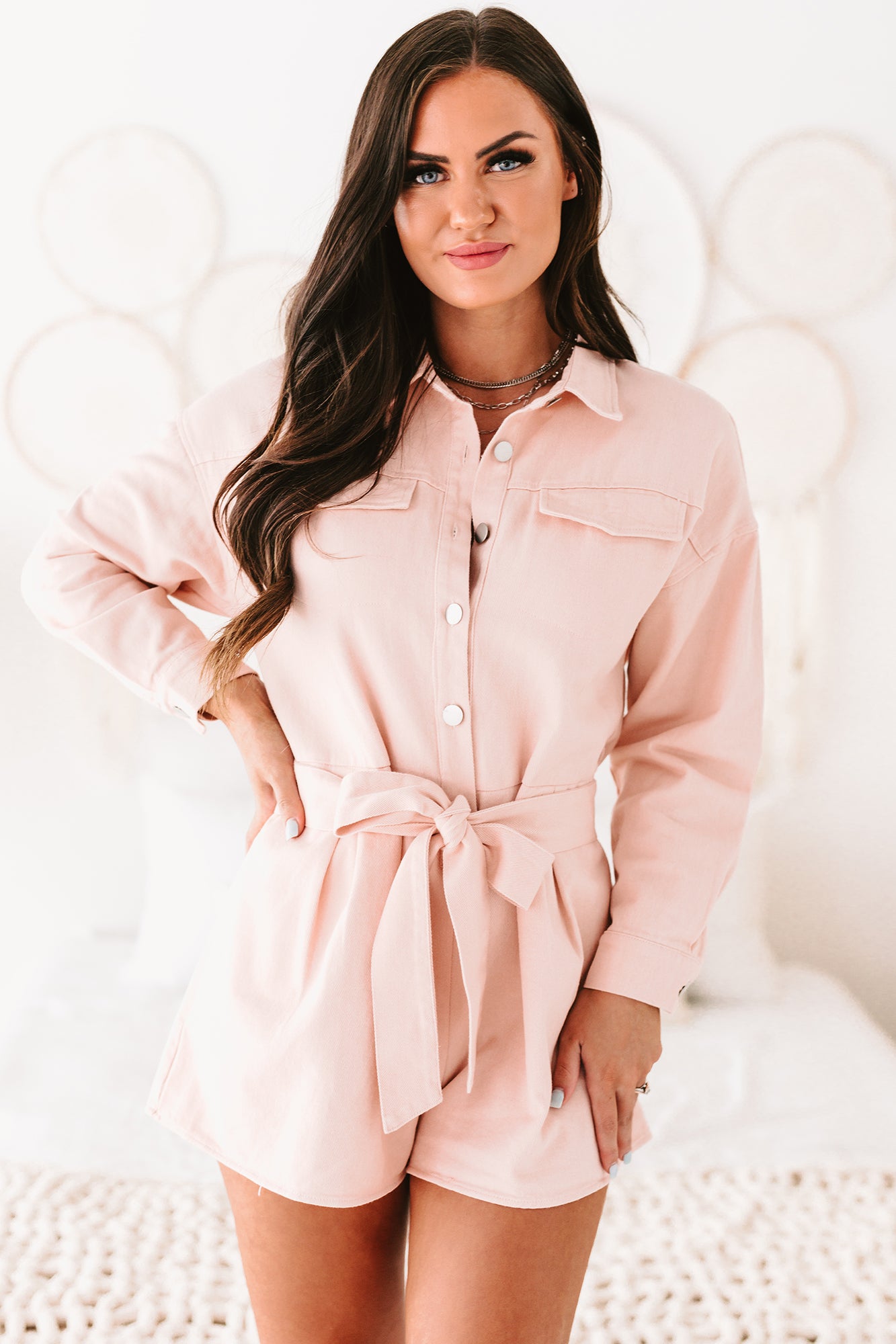 Make The Utility Trend Stylish With This Light Pink, Collared, Long Sleeve, Button-Down, Belted, Denim, Utility Romper!