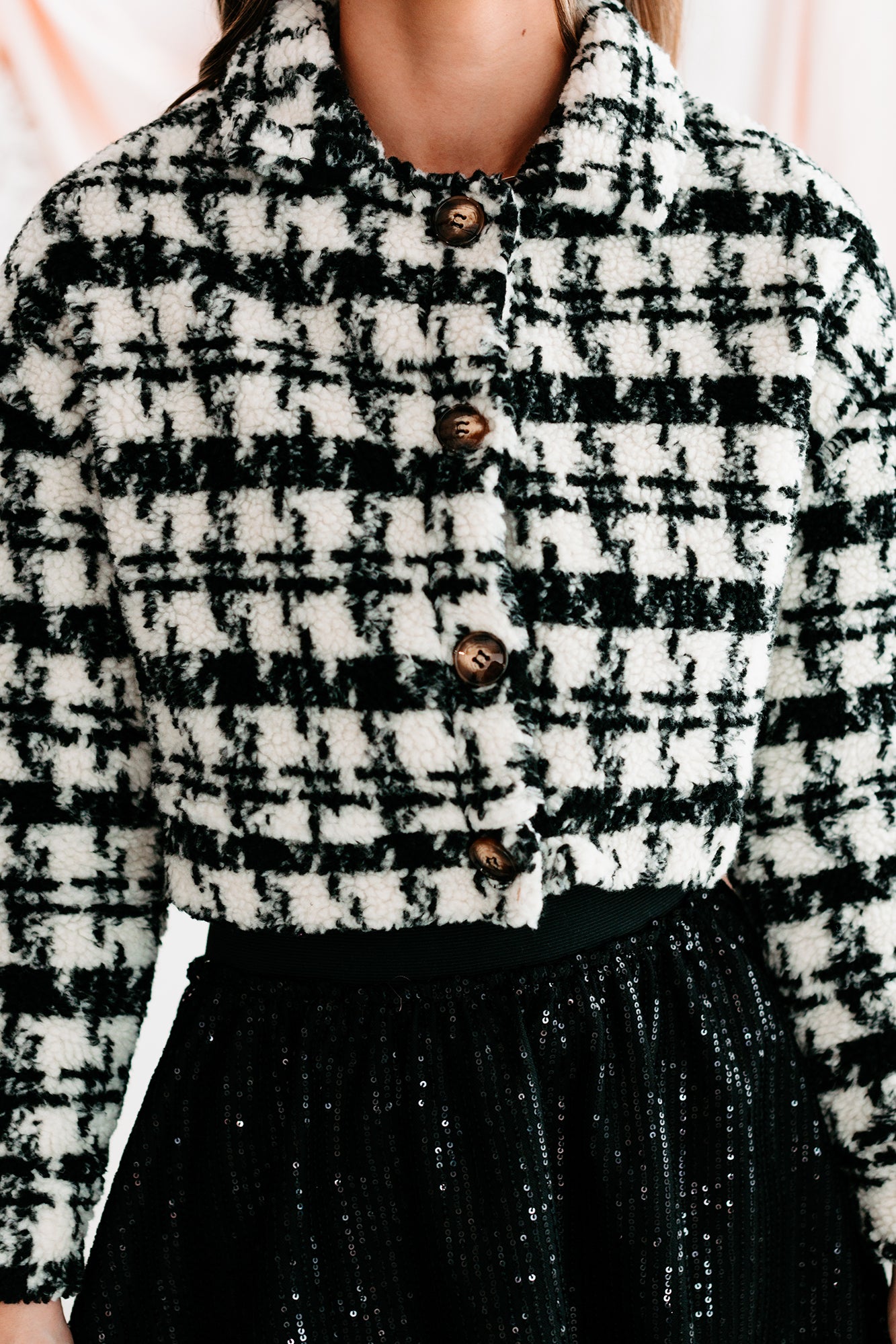 Hold Me Forever Houndstooth Print Cropped Sherpa Jacket (Black) - NanaMacs