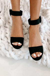 IMPERFECT Starting Rumors Faux Suede Ankle Strap Open Toe Heels (Black) - NanaMacs