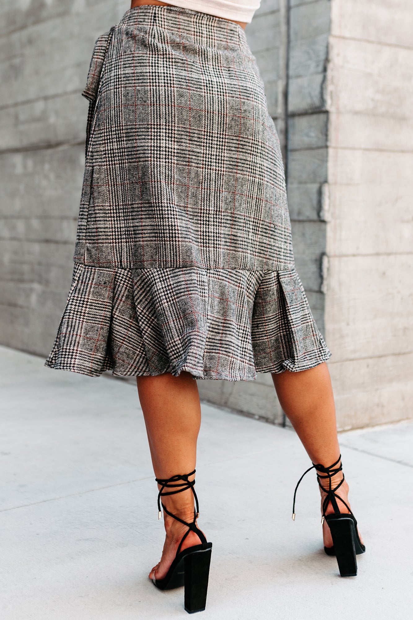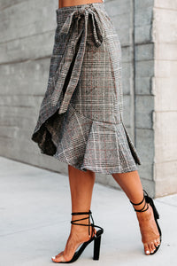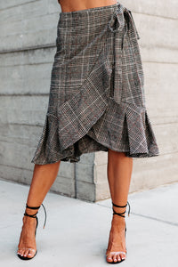 Make A Statement With This Brown, Ruffled Hem, Plaid Wrap Skirt!