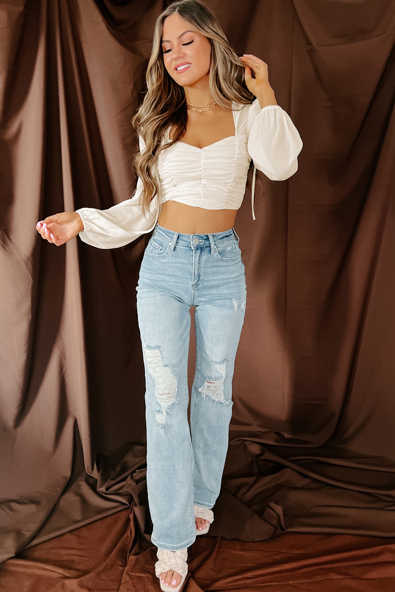 Inexplicably Gorgeous Cut-Out Ruched Long Sleeve Crop Top (Cream)
