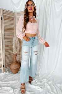 Inexplicably Gorgeous Cut-Out Ruched Long Sleeve Crop Top (Pastel Pink) - NanaMacs