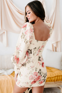 Turn Heads In This Ivory, Floral Print, Long Sleeved, Padded Bust, Fitted Mini Dress!