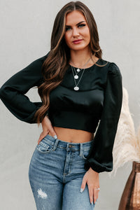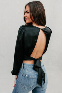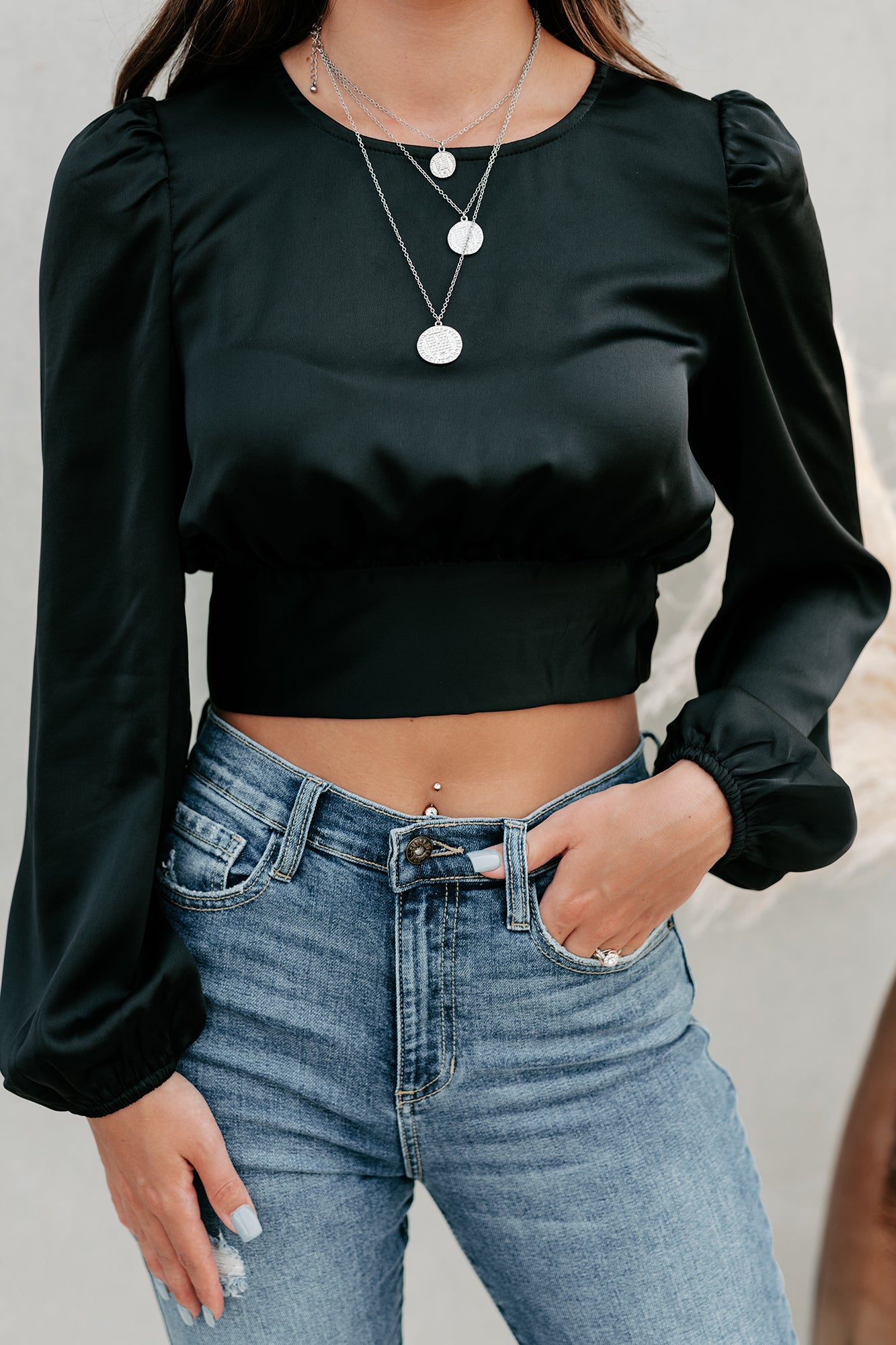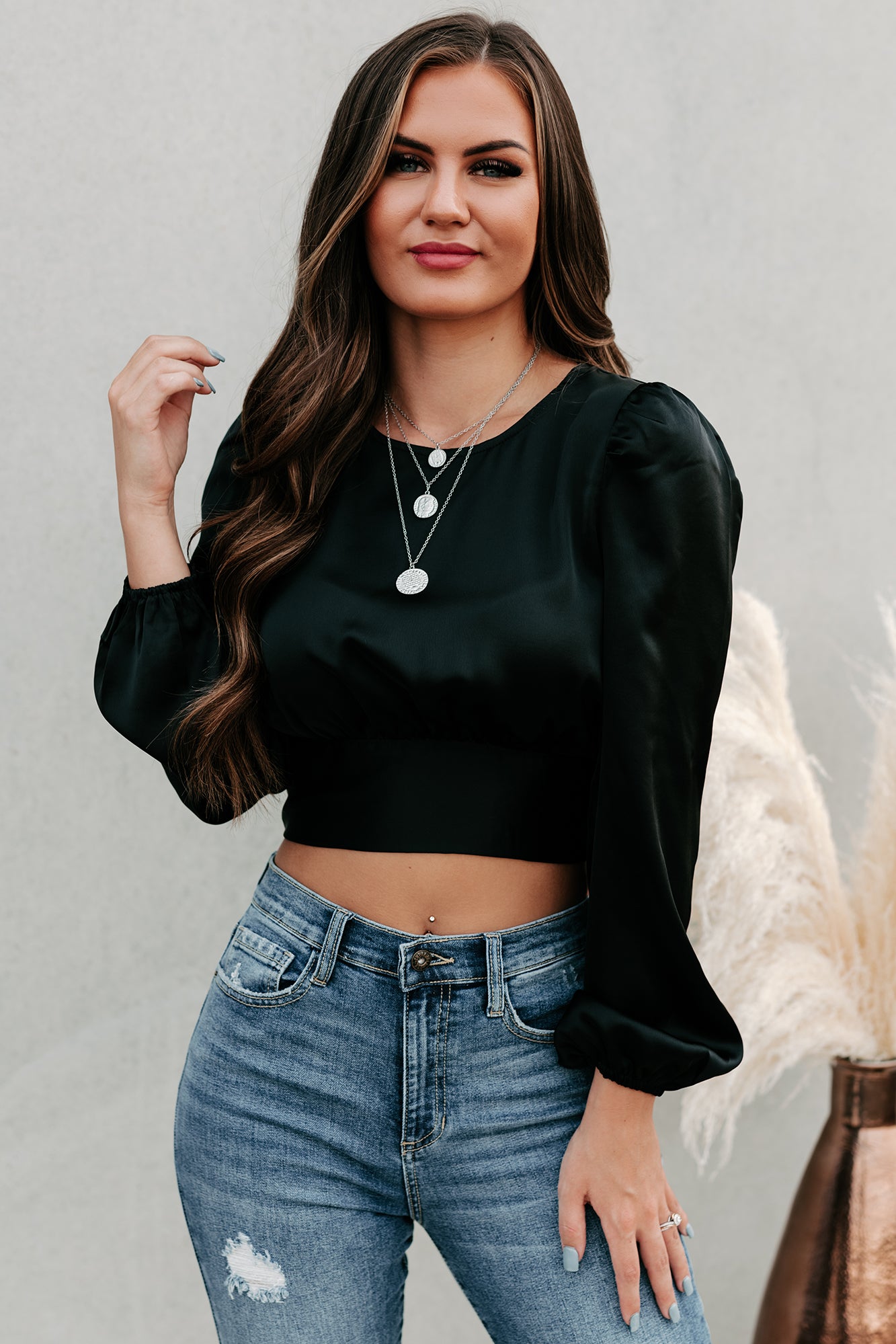 This Black, Satin, Long Sleeved, Puffed Shoulder, Tie-Back Crop Top Is Going To Make You Look Amazing!