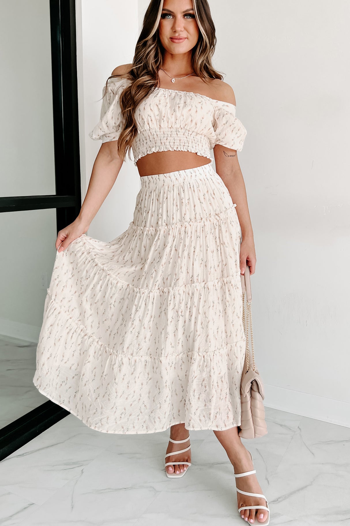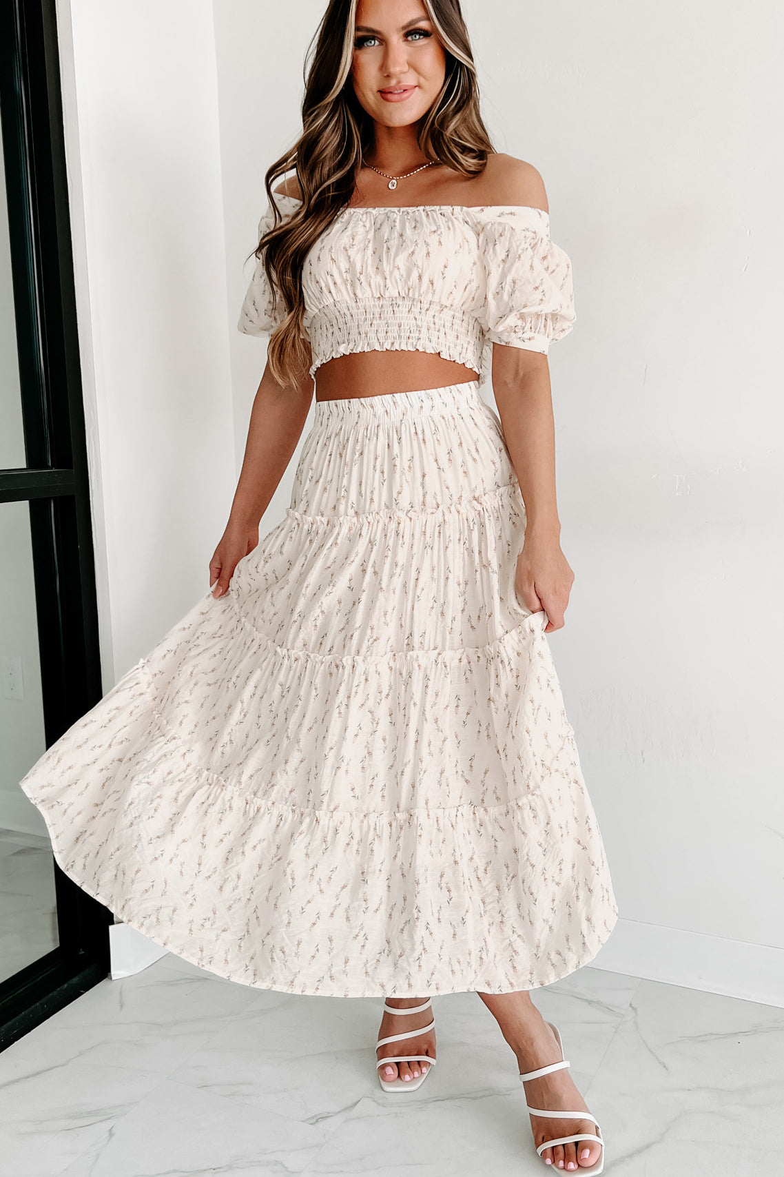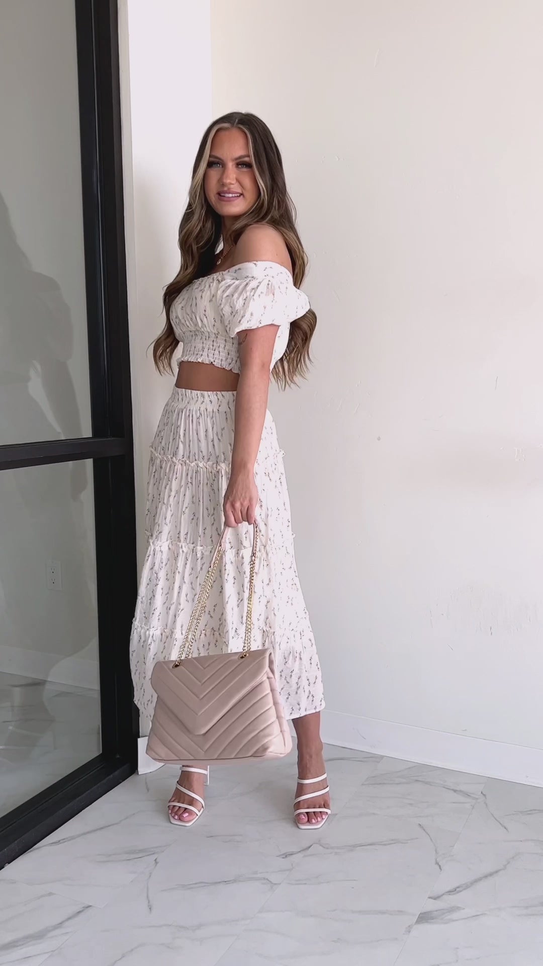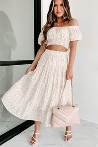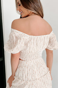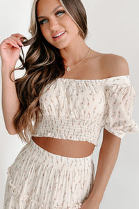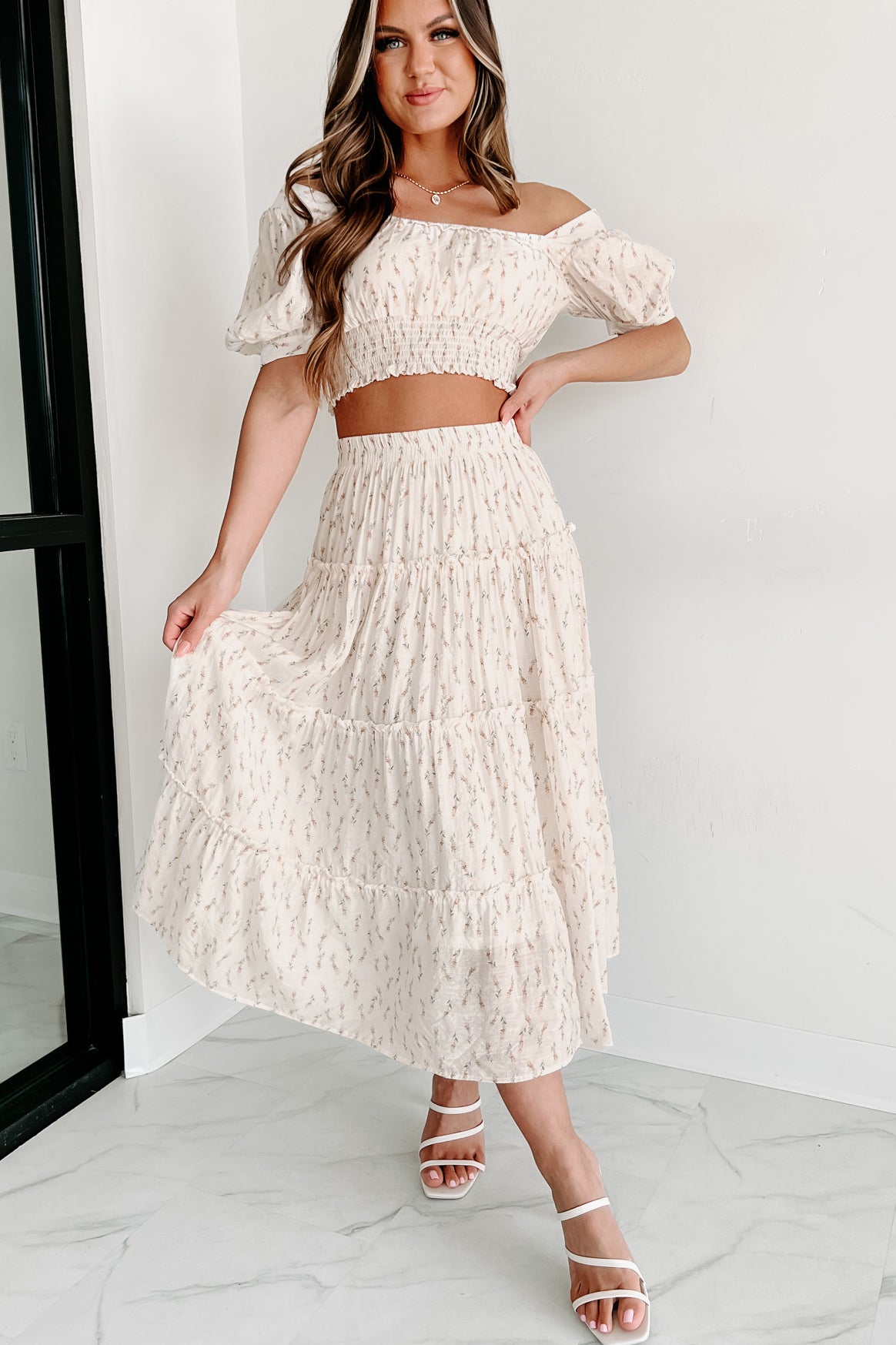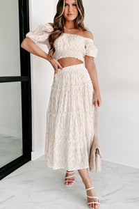Make a statement with this eye-catching cream gown! Featuring an elegant floral pattern, puff sleeves and square neckline, it's sure to turn heads. The smocked waistband brings shape while the semi cropped length adds femininity - perfect for any special occasion!