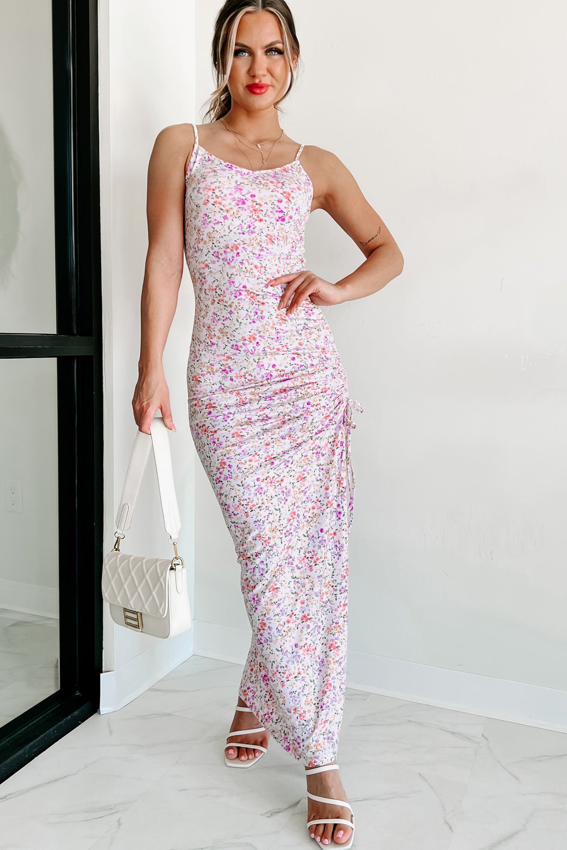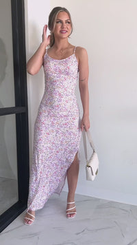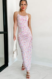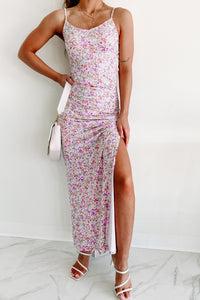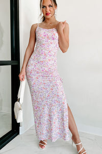 This lavender dream dress is perfect for those looking to make a statement. Featuring an all-over floral pattern, adjustable straps, and a V shape neckline that flows into adjustable ruched side detailing while the maxi length skirt features charming side leg slits - this garment will add glamour to any look!