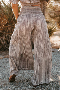 These Brown, Wide-Leg Pants Make A Fashionable Statement With The Smocked Waistband, Tie-Front Detail, & Tiered Sides!