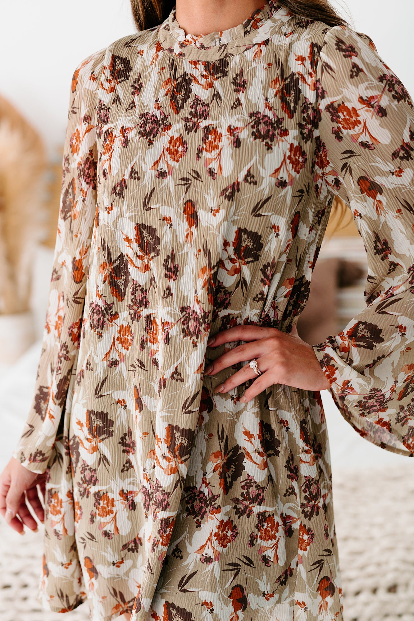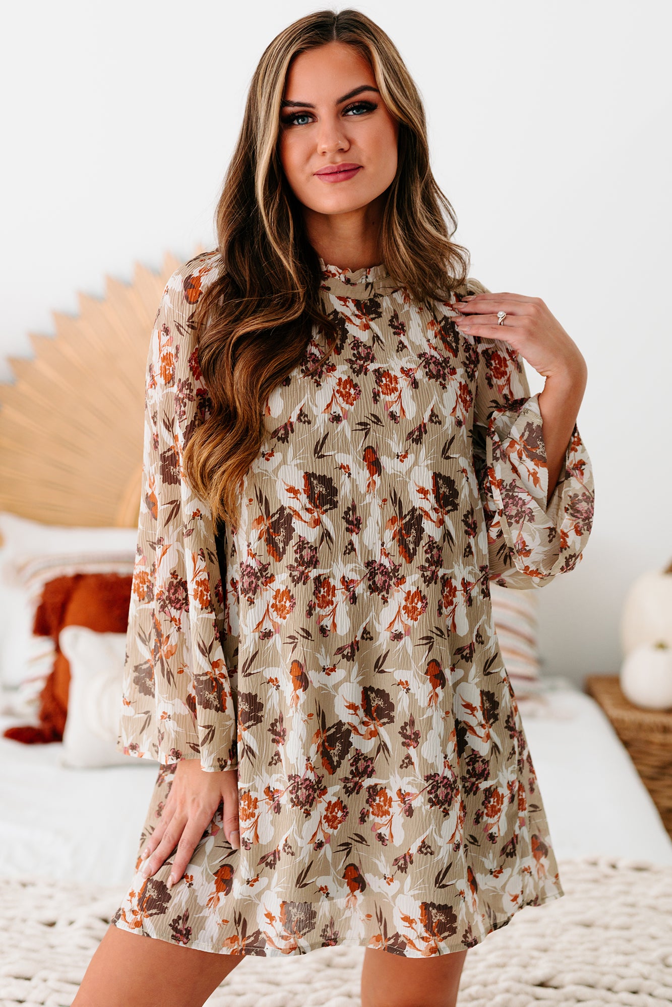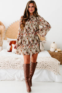 Lifetime Of Memories Floral Long Sleeve Swing Dress (Taupe) - NanaMacs