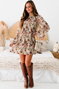 Lifetime Of Memories Floral Long Sleeve Swing Dress (Taupe)