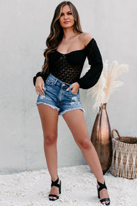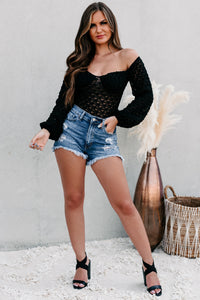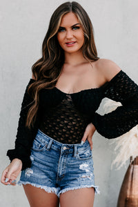 Add This Unique, Black, Sheer Lace, Padded, Off The Shoulder, Long Sleeve Bodysuit To Your Wardrobe Today!