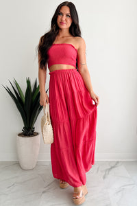 Low-Key Luxury Smocked Bandeau & Maxi Skirt Set (Coral Red)