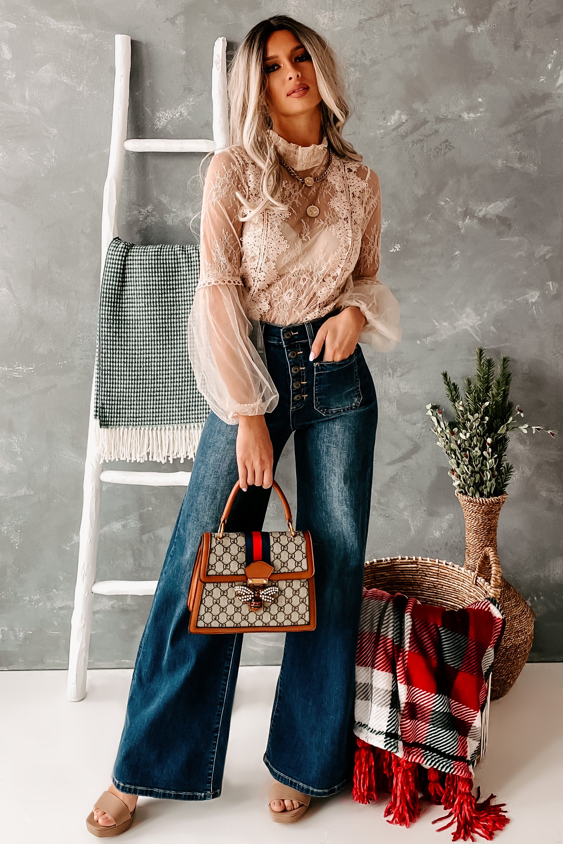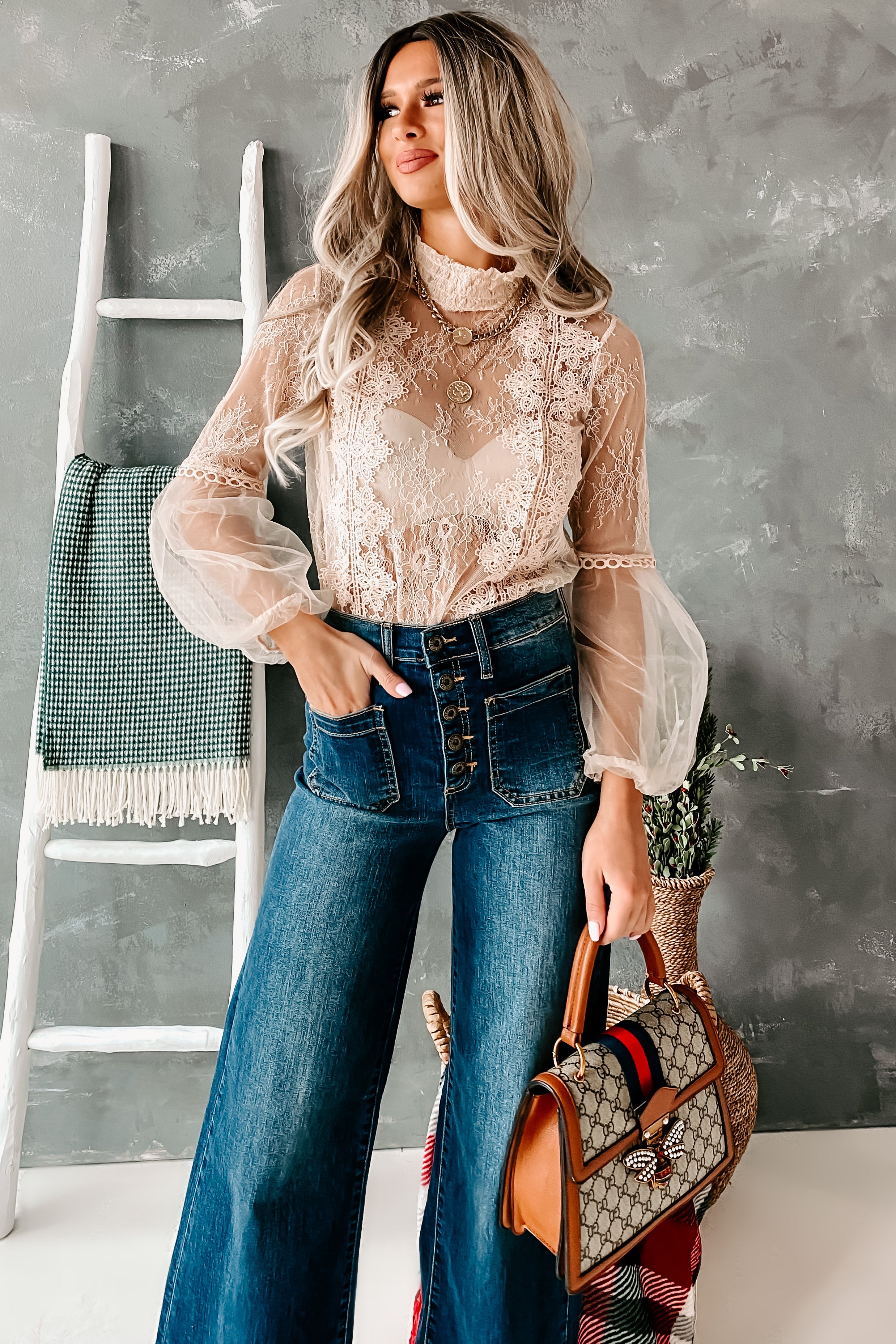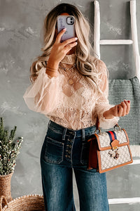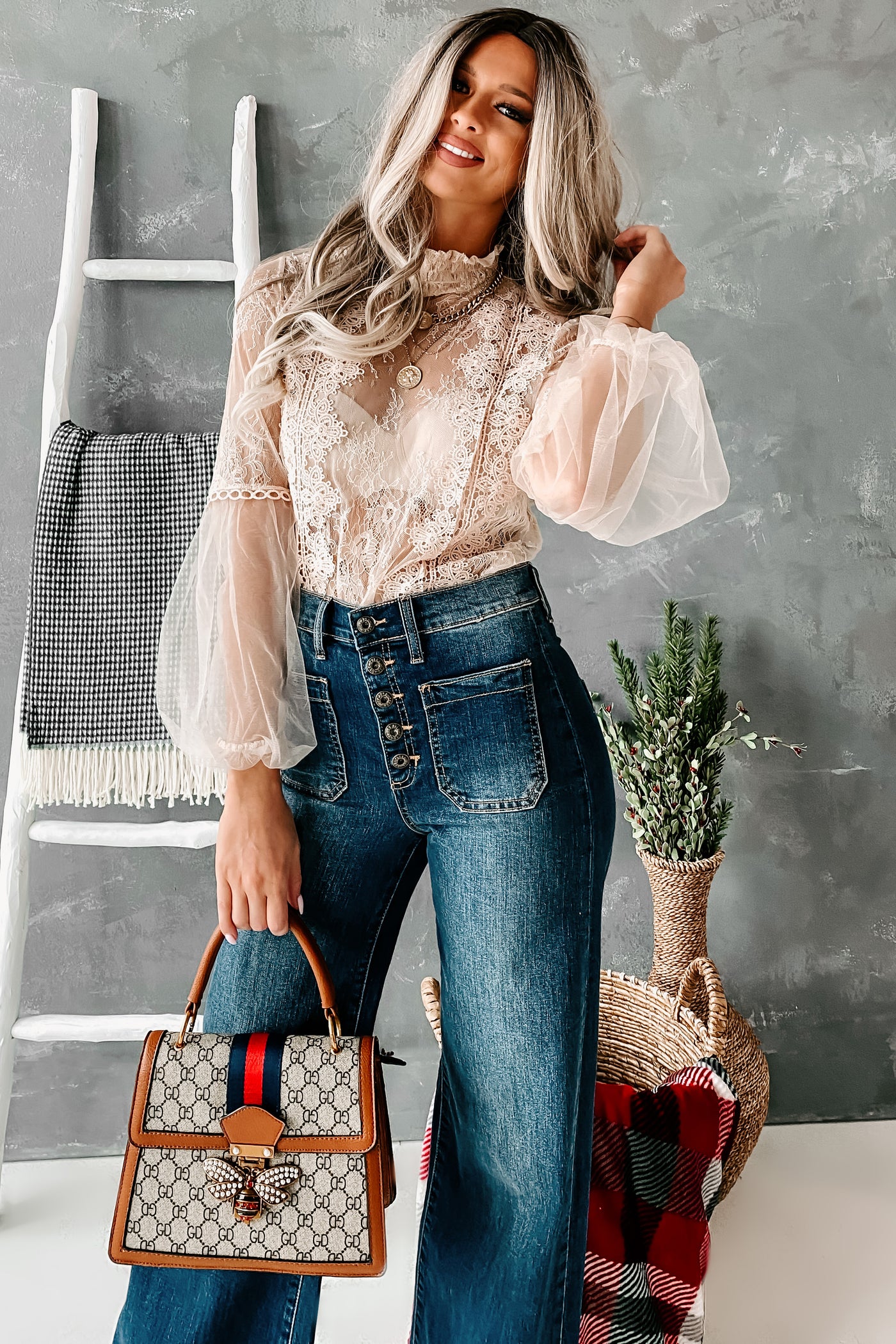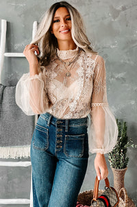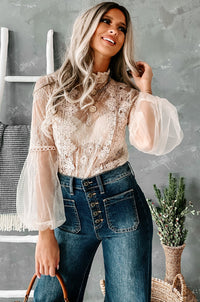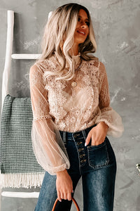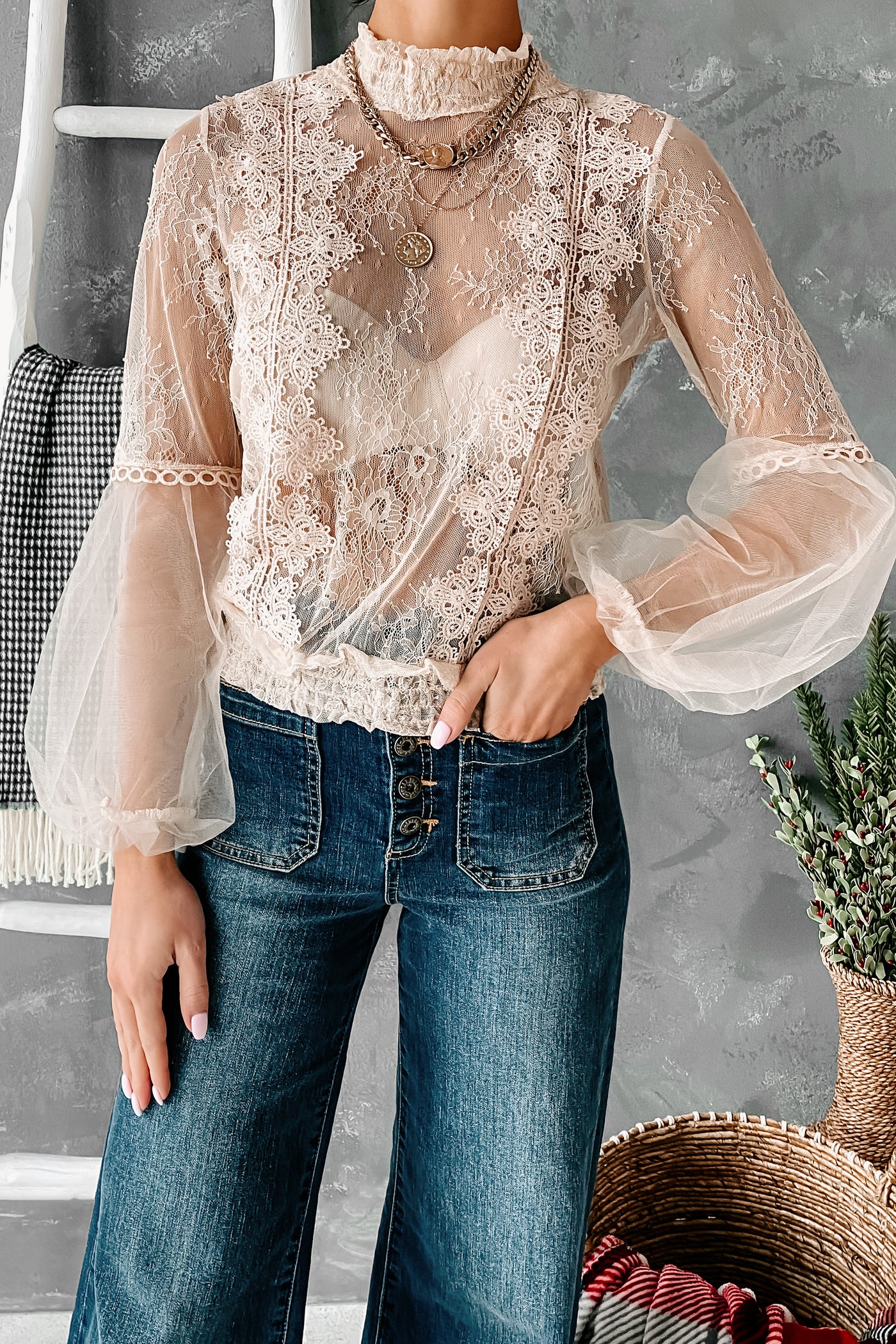 Make Him Pay Lace Balloon Sleeve Top (Champagne) - NanaMacs
