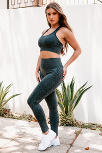 This black, mineral-washed sports bra has the coolest tri-strap design with subtle lattice print details, & padded cups- making it perfect to wear at home or to the gym!