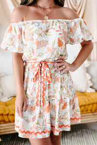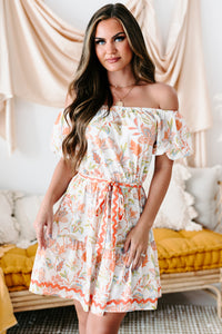 If You're Looking For A Cute Dress Then Look No Further Than This Ivory & Orange, Off The Shoulder, Puffy Sleeved, Belted, Floral Print Dress!
