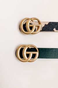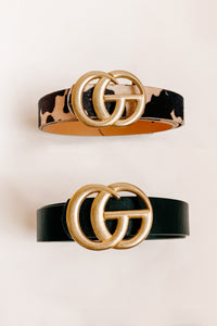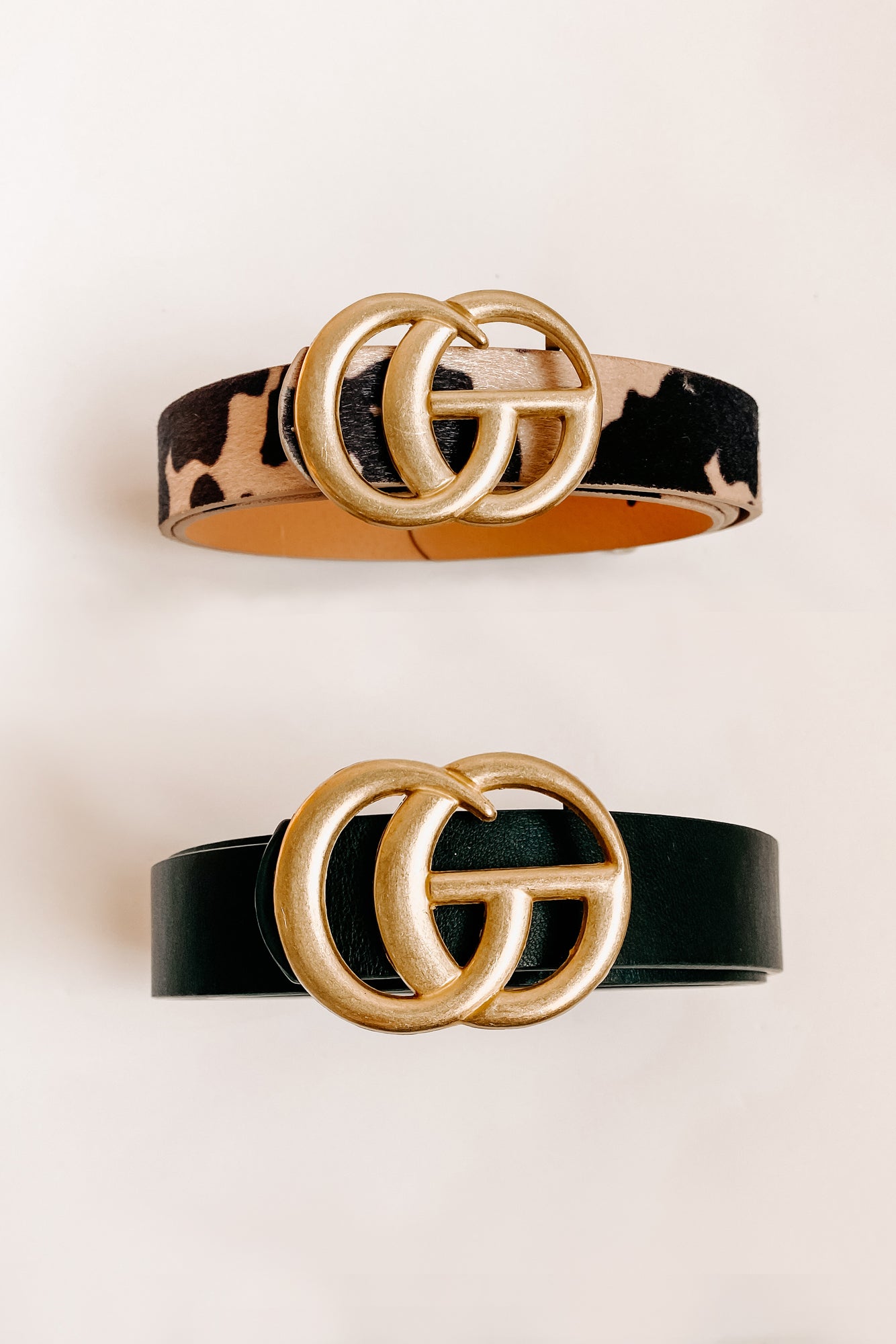 Don't Miss Out On This Beige, Faux Fur, Spotted/Cow Print, & Black, Faux Leather, Letter Buckled Belt Set!