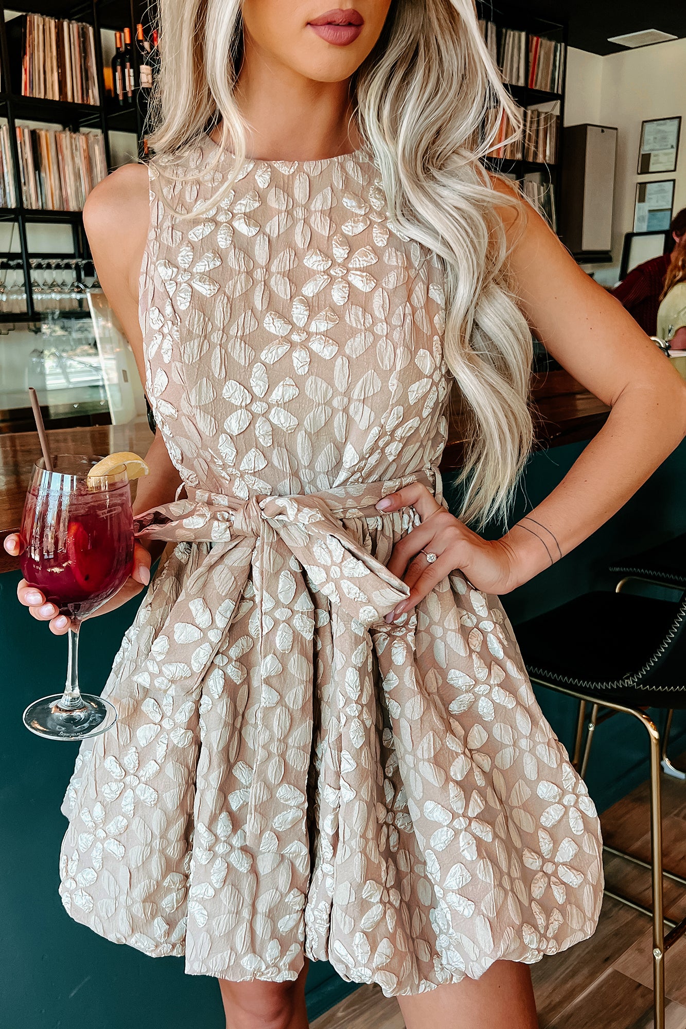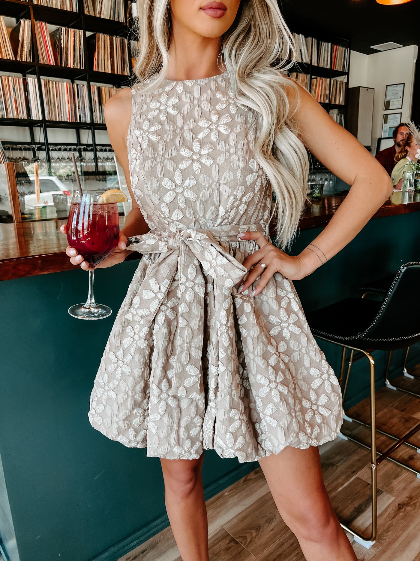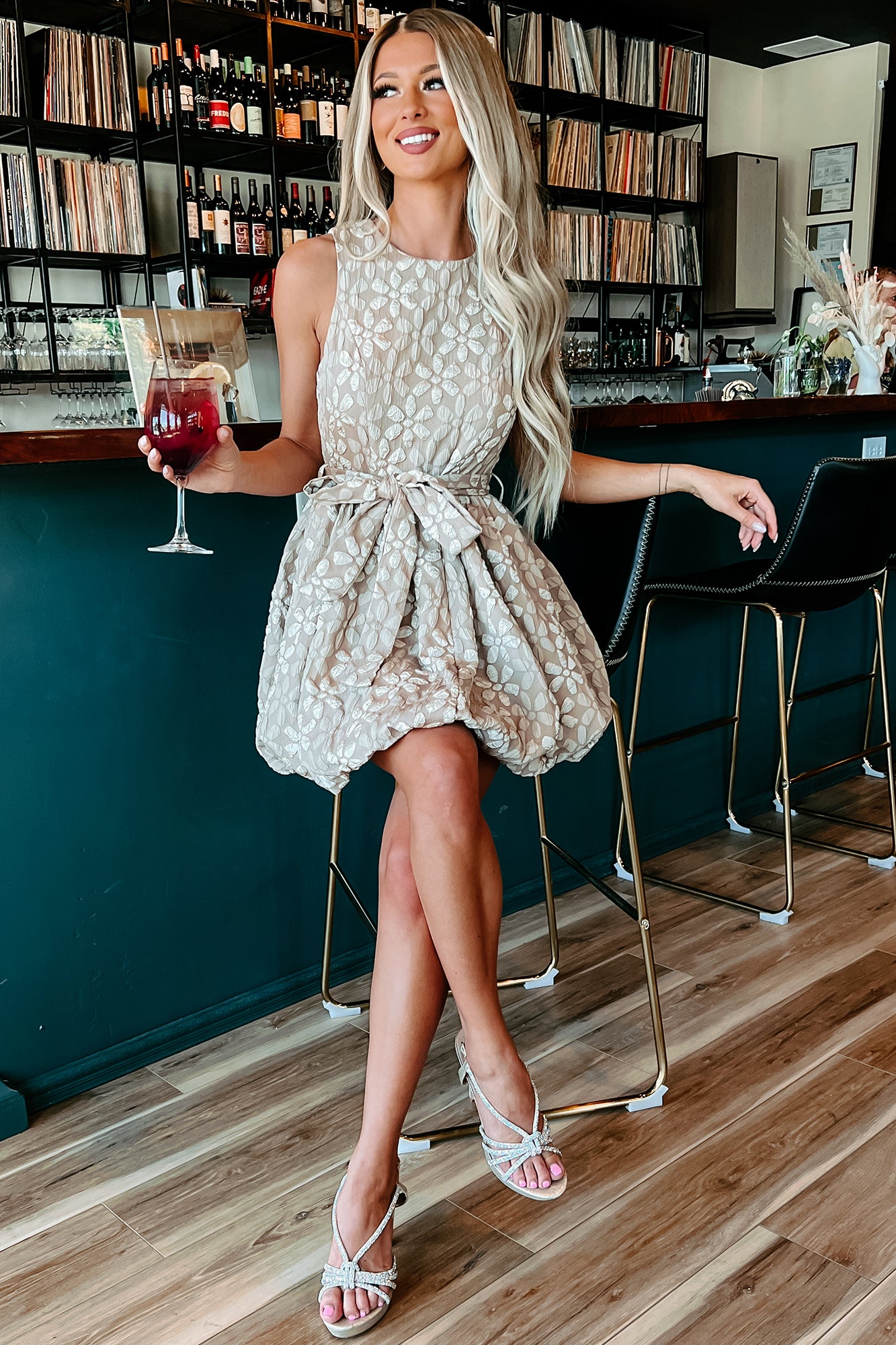 Be Unique At Your Next Event In This Taupe, Bubble Hem Mini Dress! The Floral Textured Fabric Is So Fun & The Neutral Color Makes This Dress Perfect For Any Occasion!