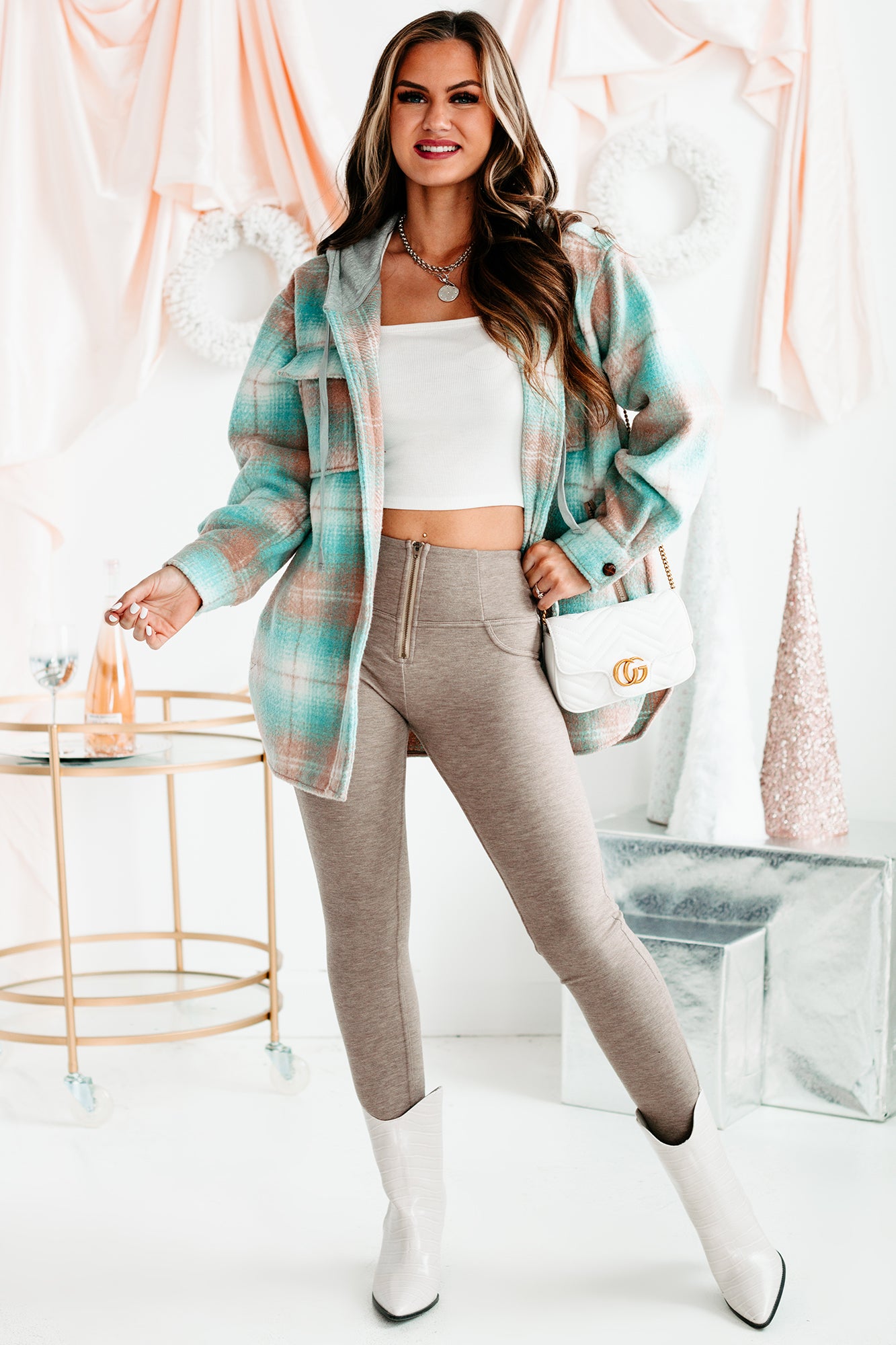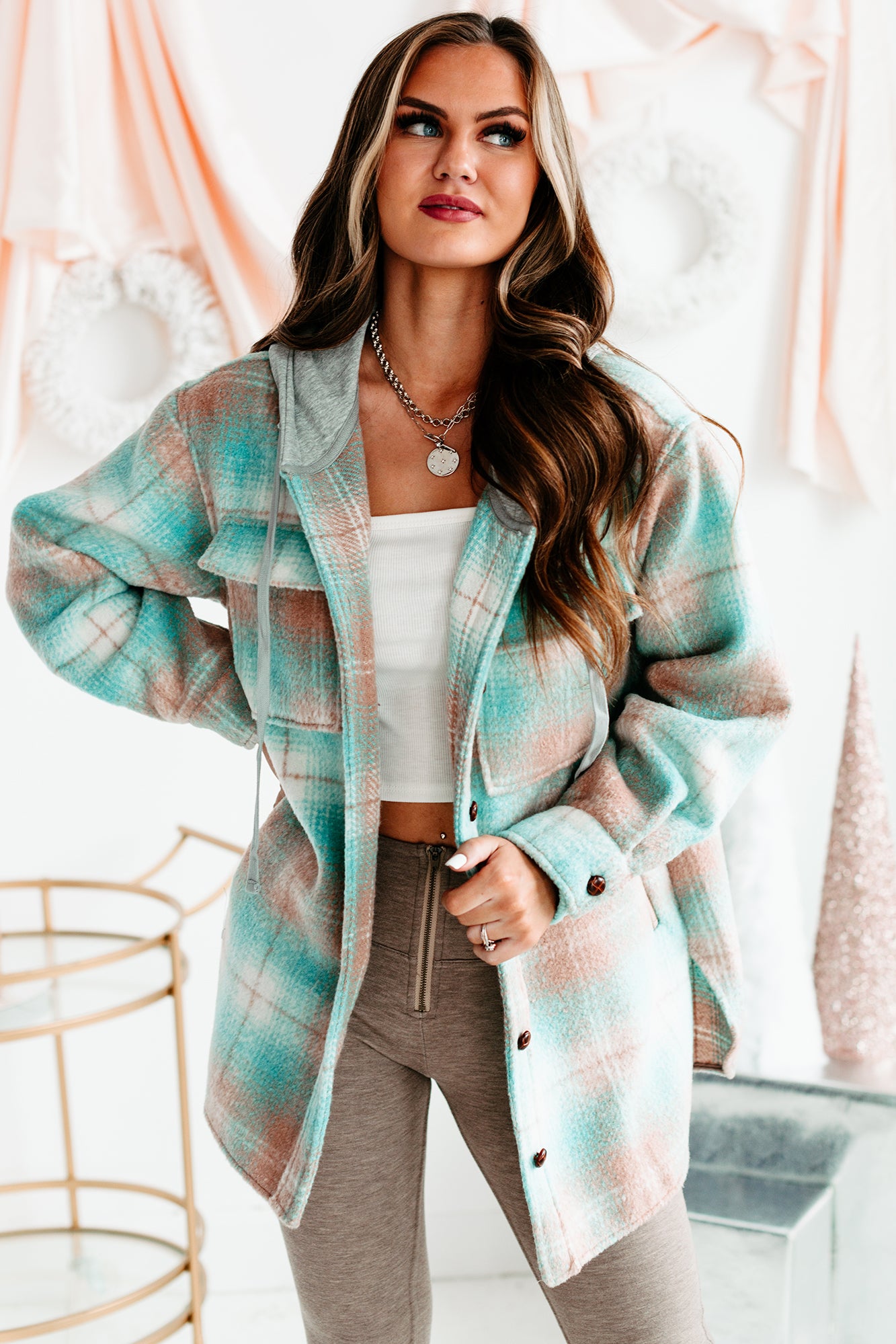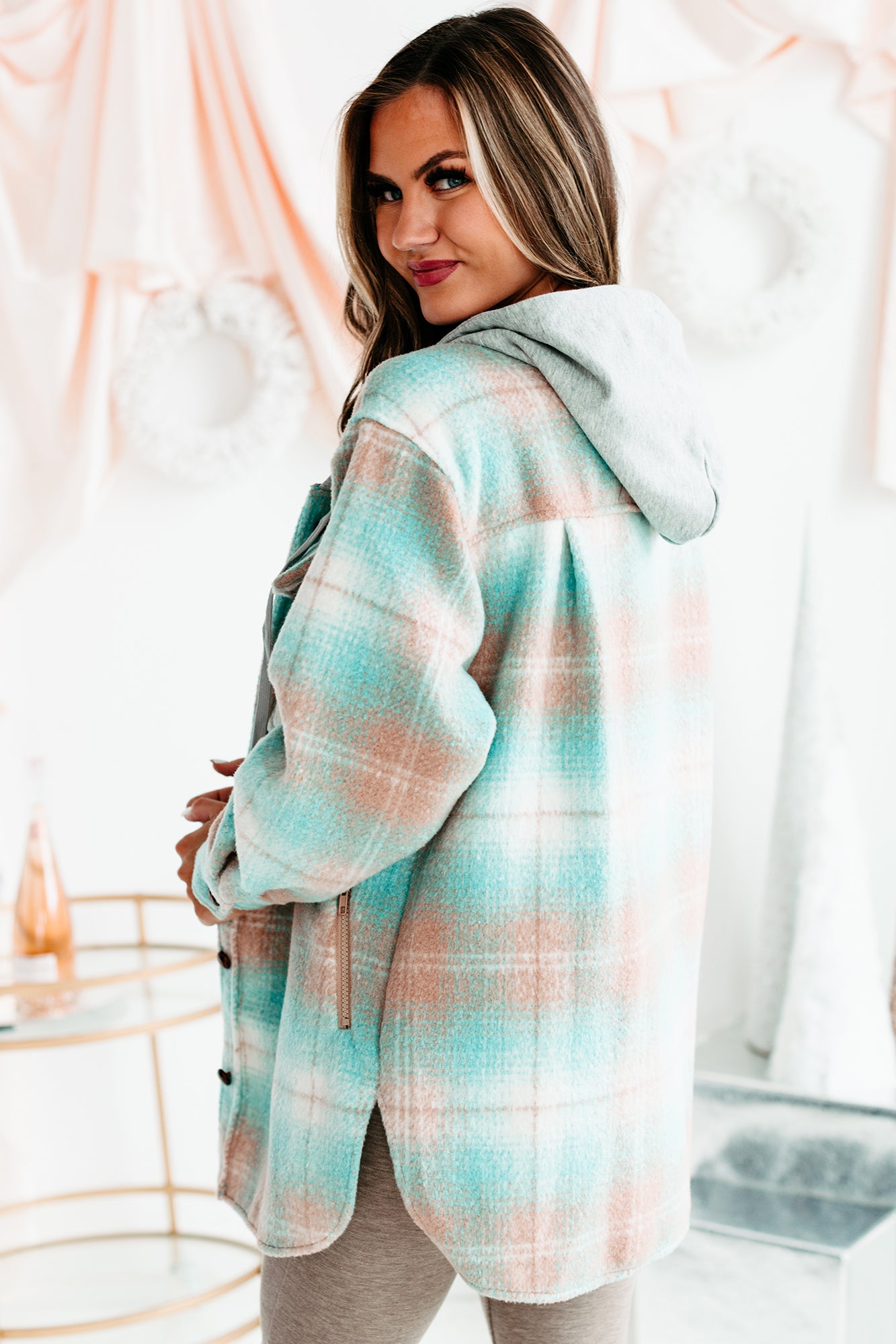 Mountain Retreat Hooded Plaid Shacket (Teal/Sand) - NanaMacs