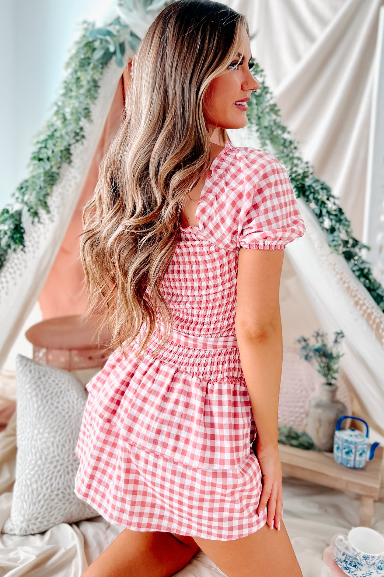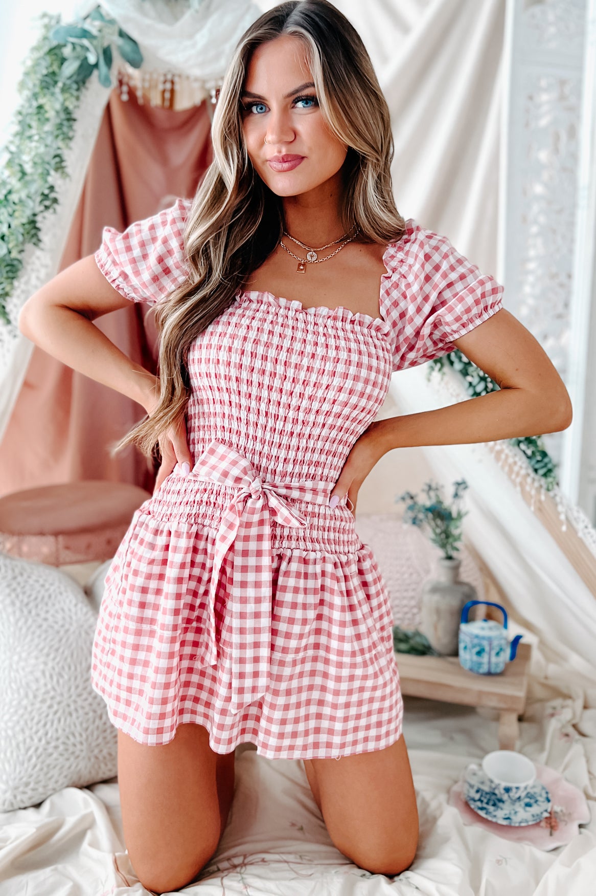 Oh So Southern Gingham Smocked Mini Dress (Rose/White)