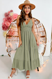 This Light Olive, Crochet Lace Midi Dress Will Make You Feel Like A Dream! You'll Love The Bralette Style Top & Tiered Midi Design!