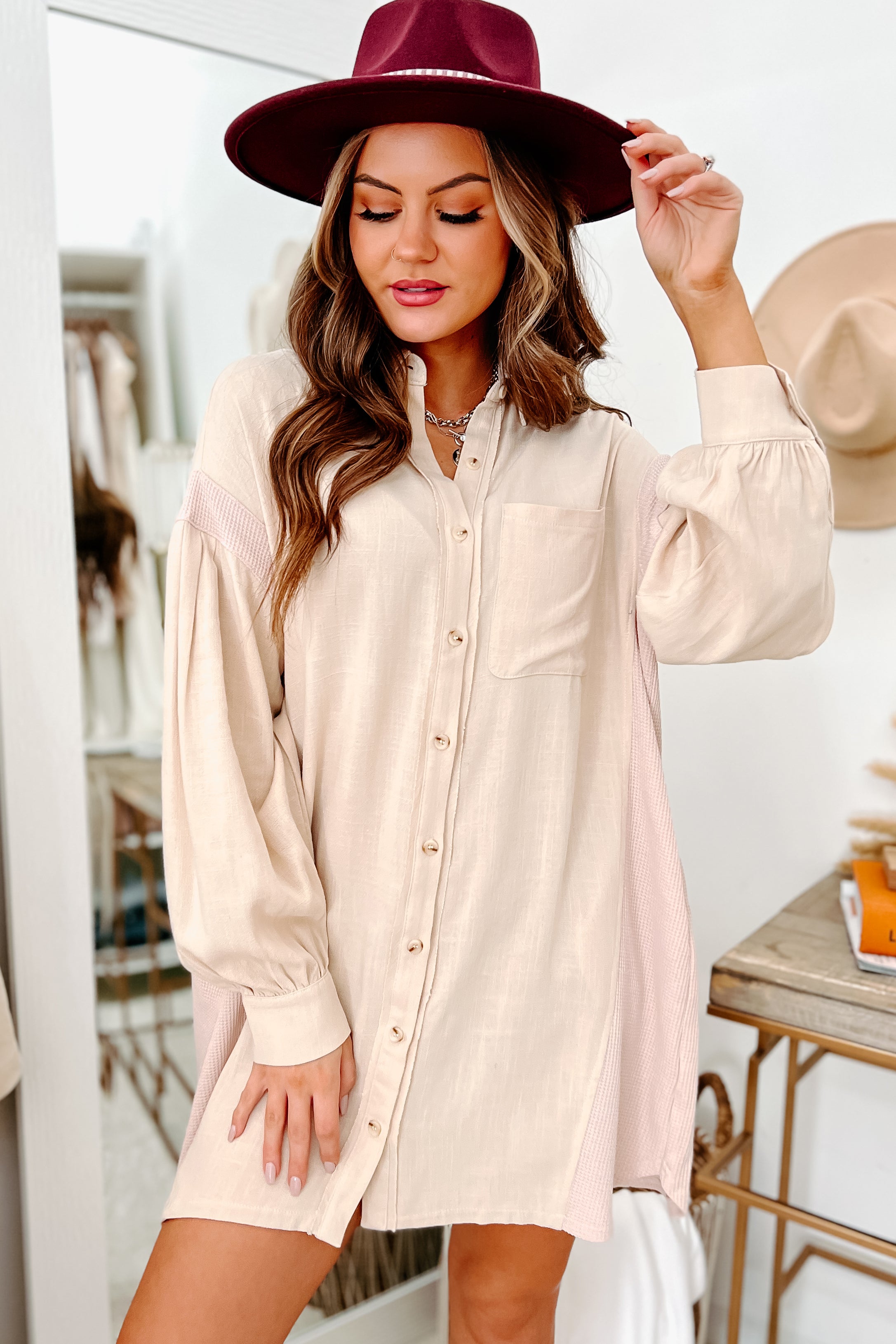 Out Of Reach Mix Media Button Up Shirt Dress (Sand)