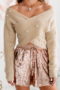 This Oatmeal, Pearl Embellished Sweater Has A Criss-Cross Front Design & Cropped Fit That You're Going To Love!