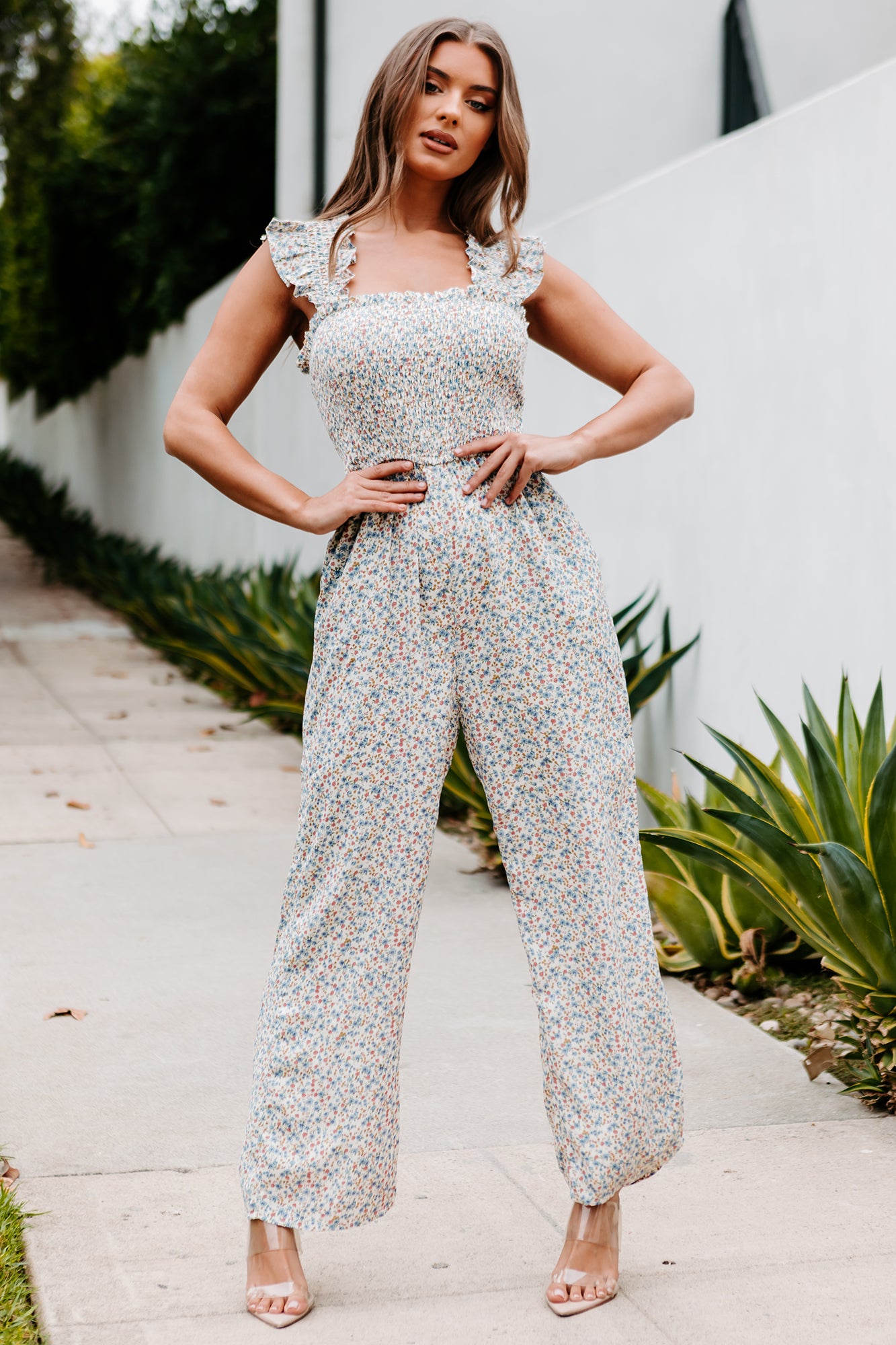 Picnic Perfect Smocked Floral Jumpsuit (Blue Multi)