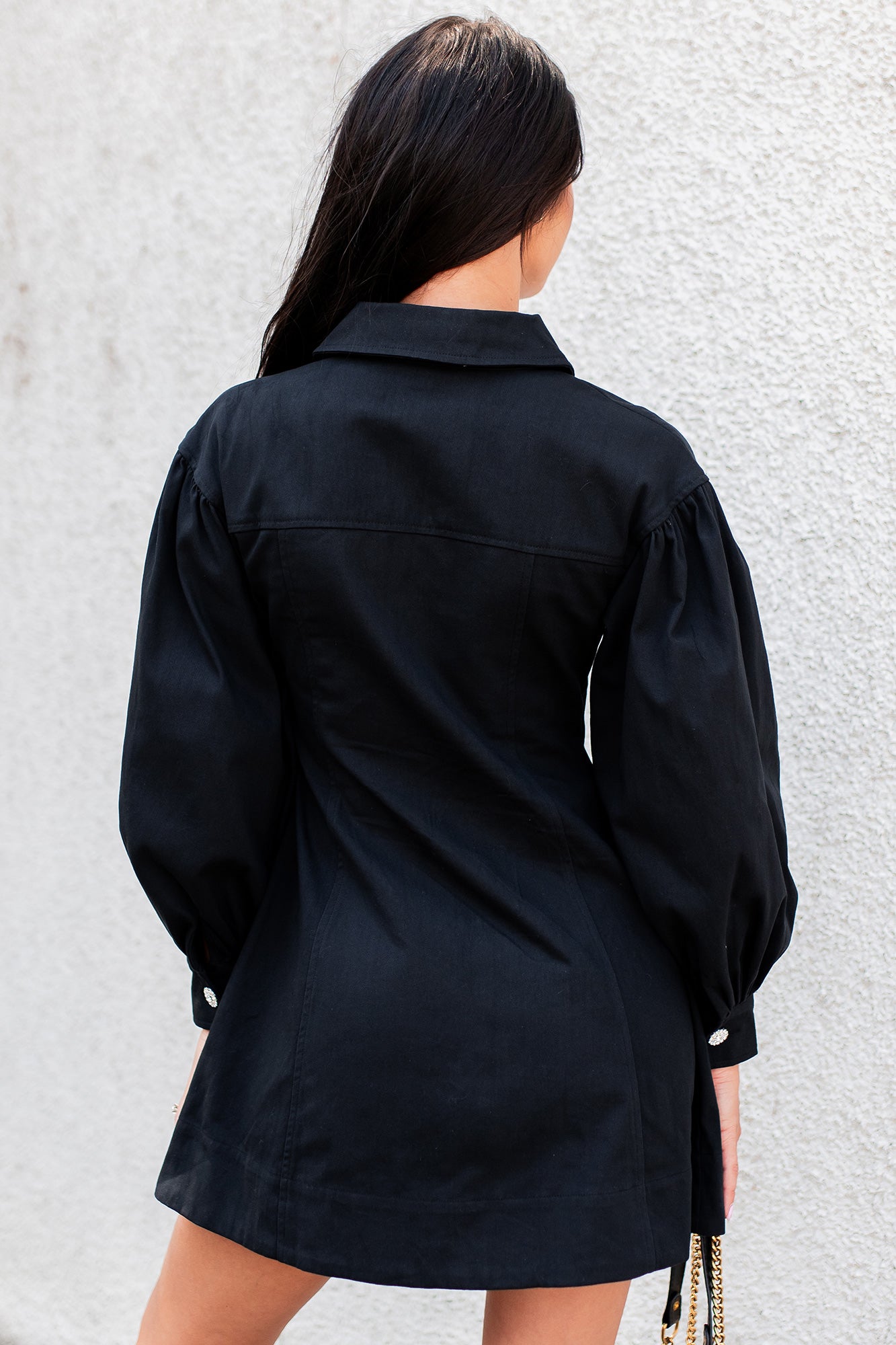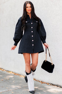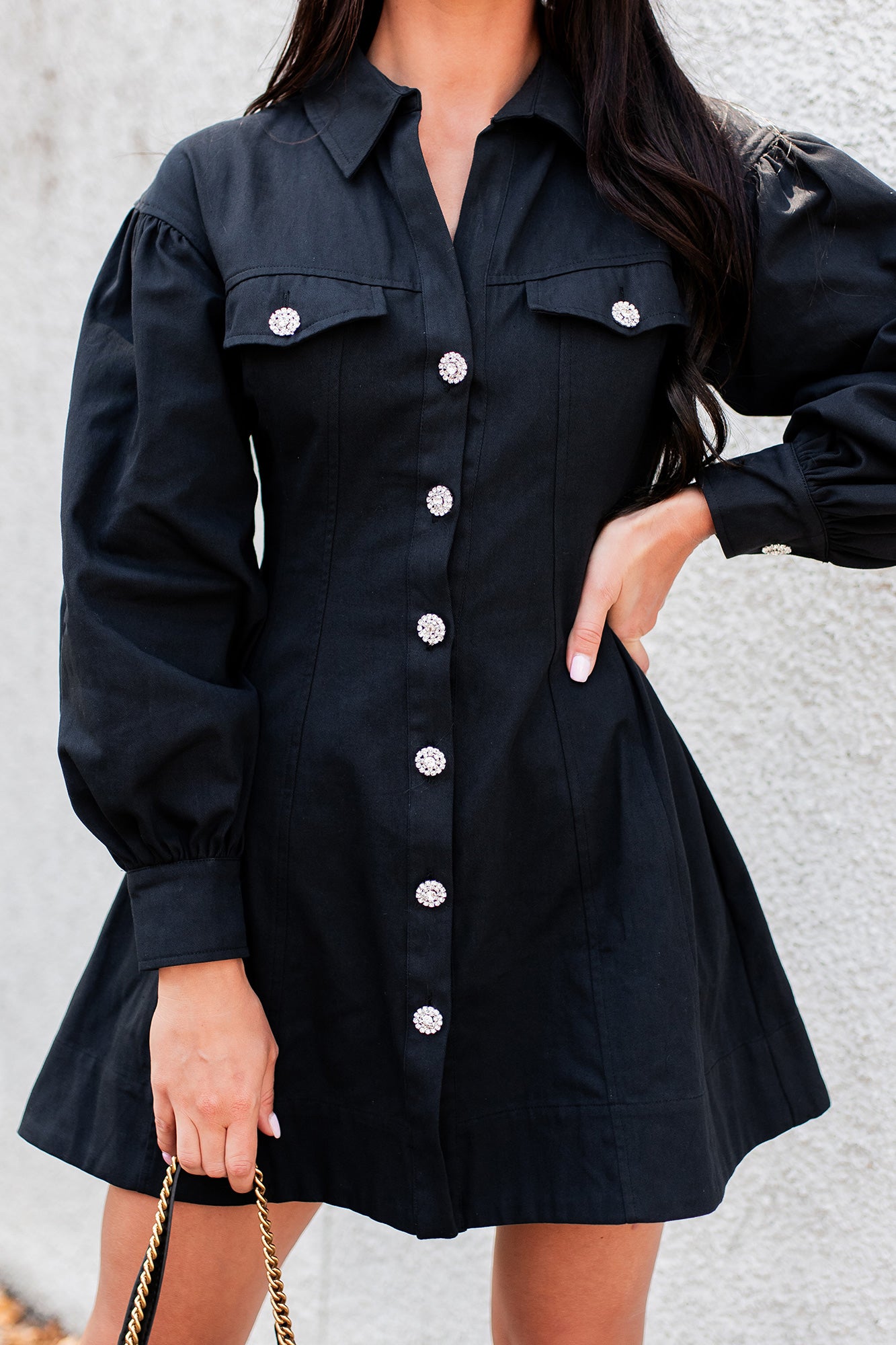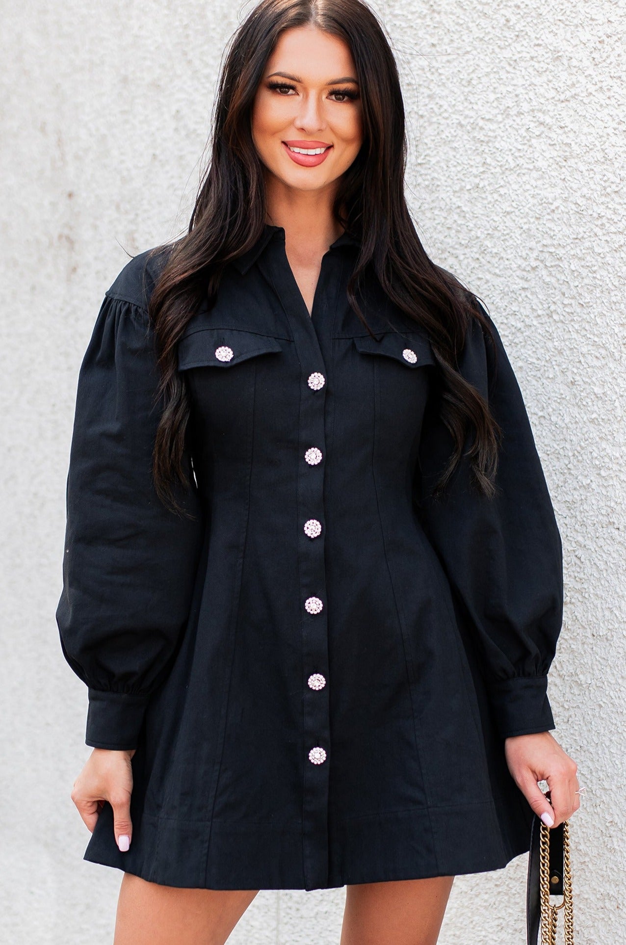 Pressure To Succeed Rhinestone Button Shirt Dress (Black)