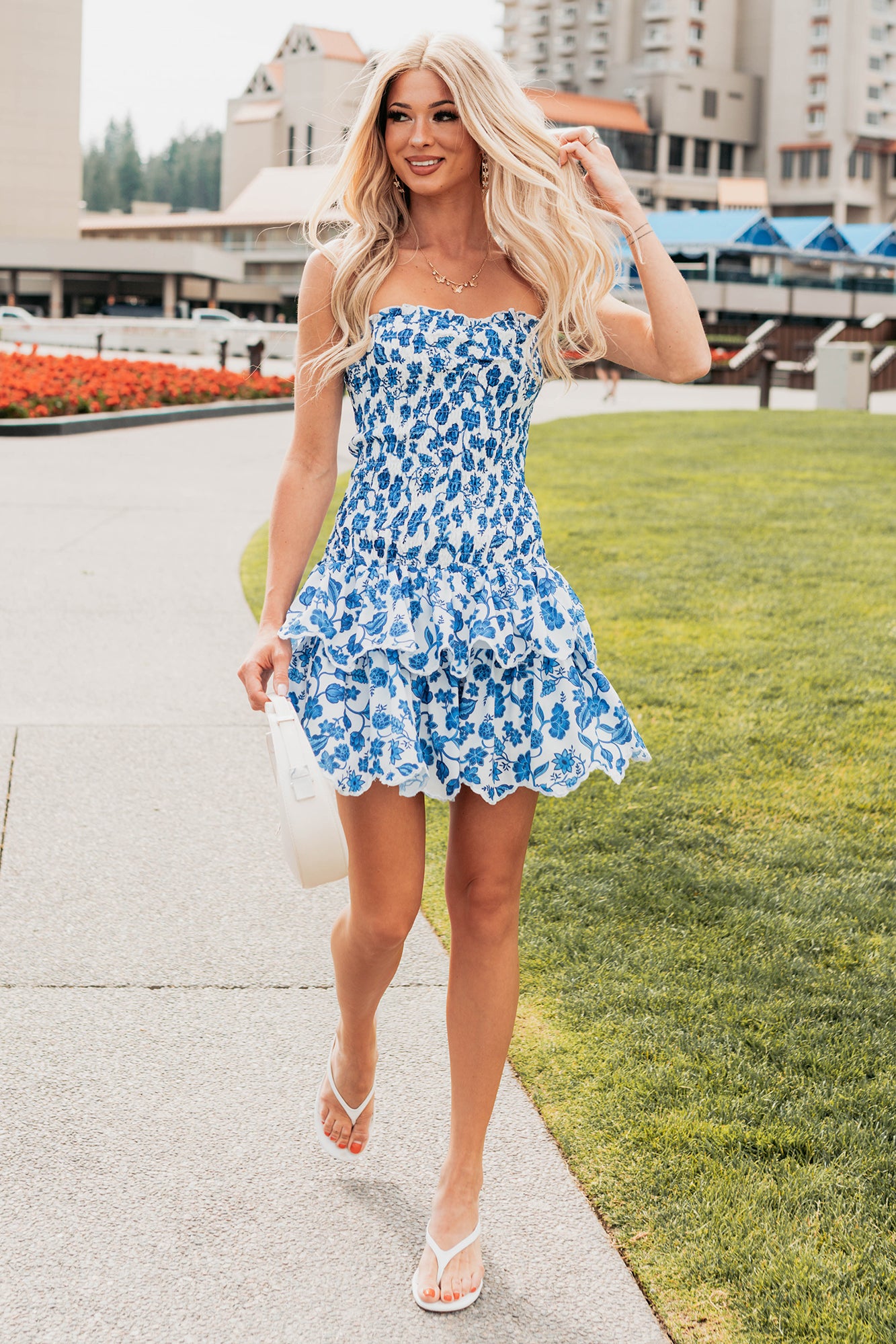 Ran My Way Smocked Floral Mini Dress (White/Blue)