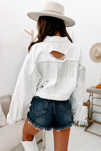 Rhinestone Dreams Rhinestone Fringe Cropped Denim Jacket (White)