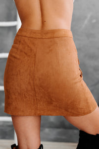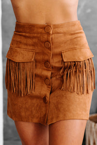 This Camel, Faux Suede, Button-Front, Fringe Mini Skirt Can Be Worn As Boho Or Western Wear!