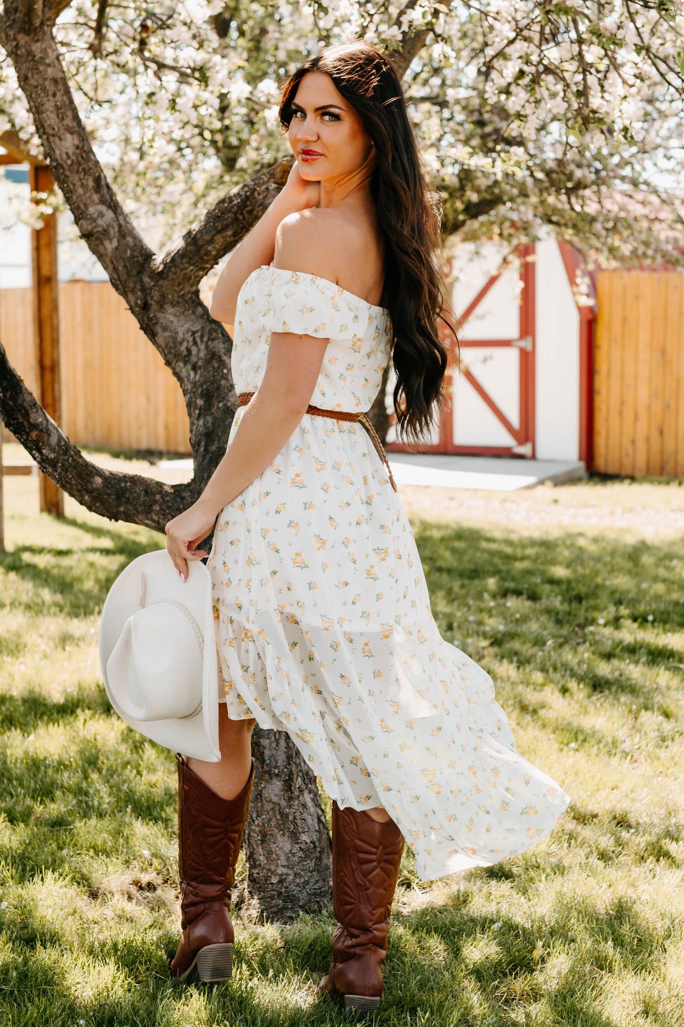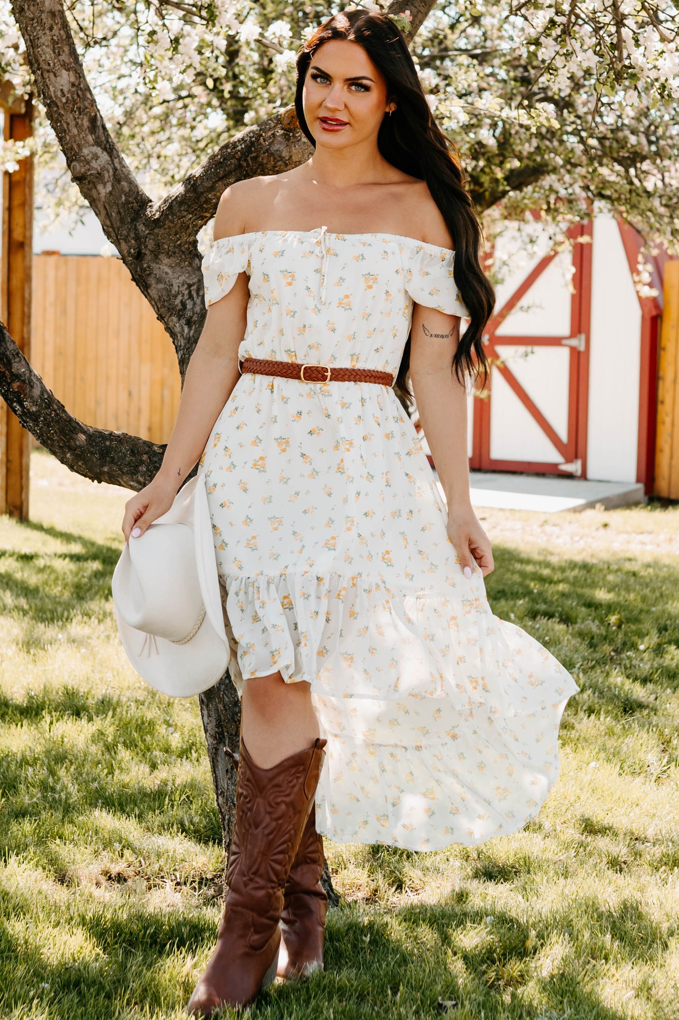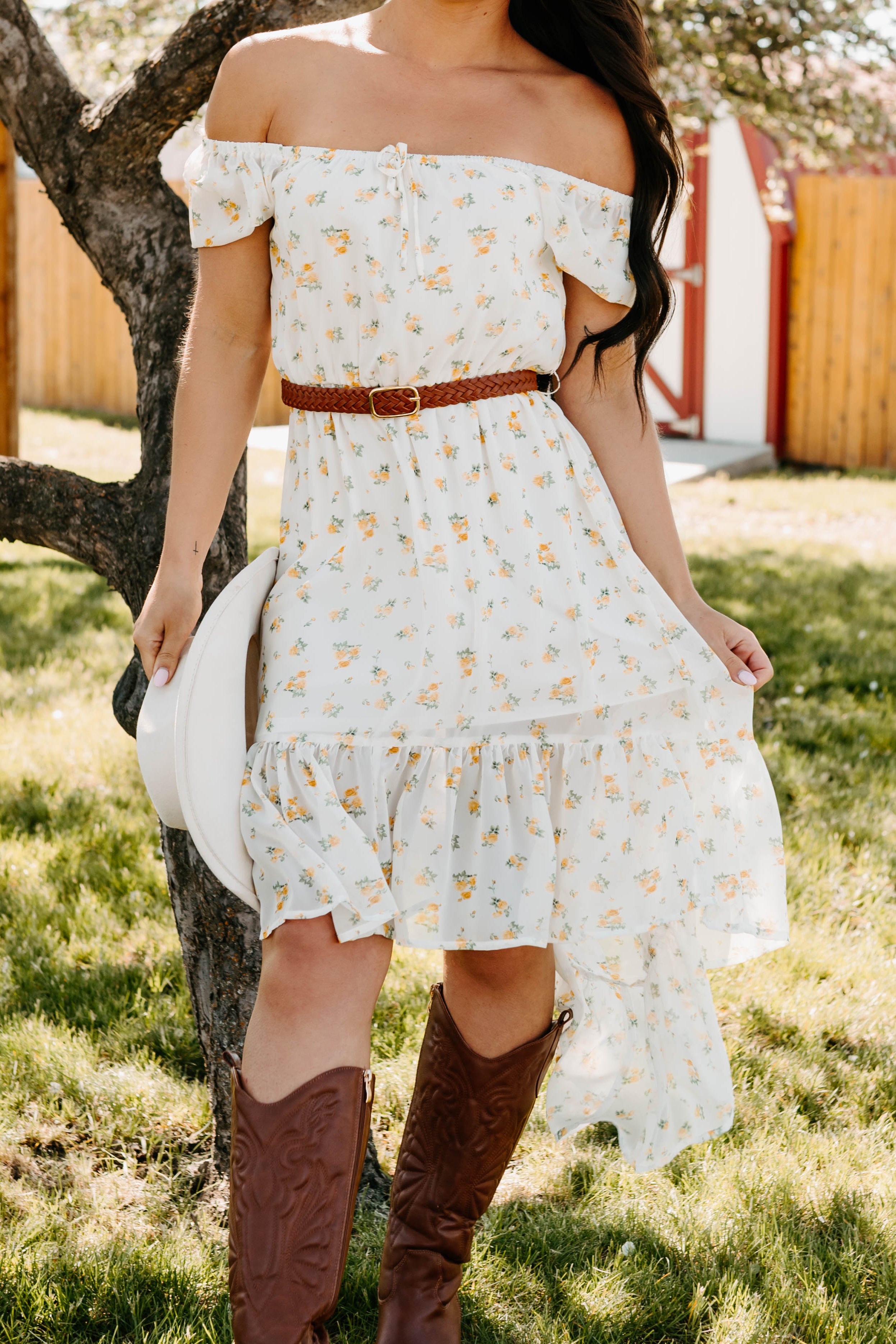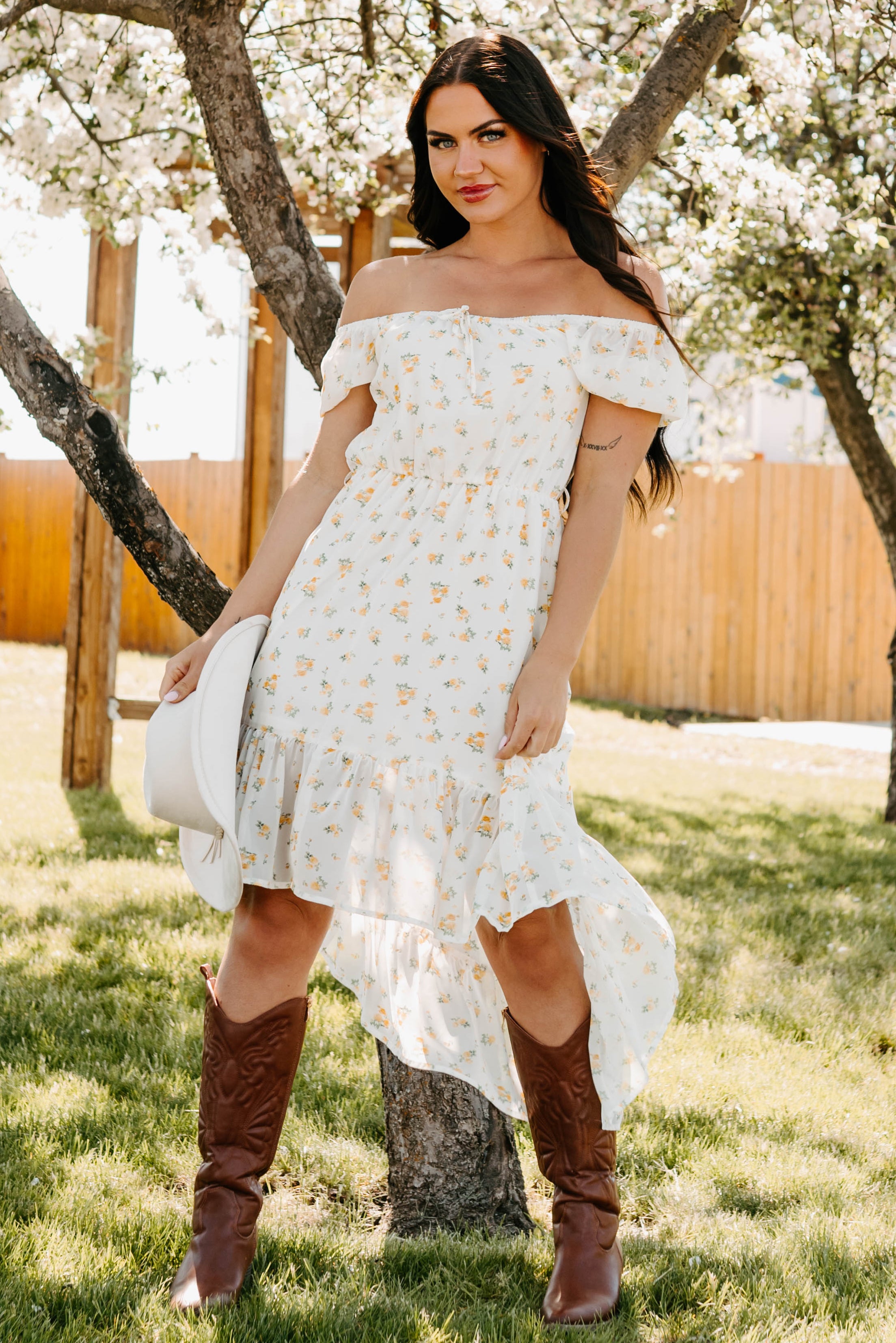 Ruffle In The Breeze High-Low Floral Print Dress (Ivory/Gold) - NanaMacs