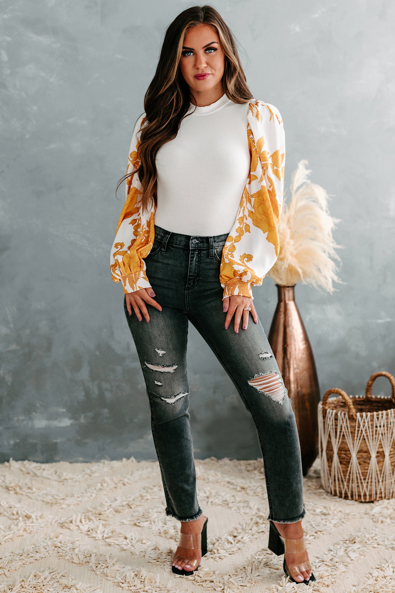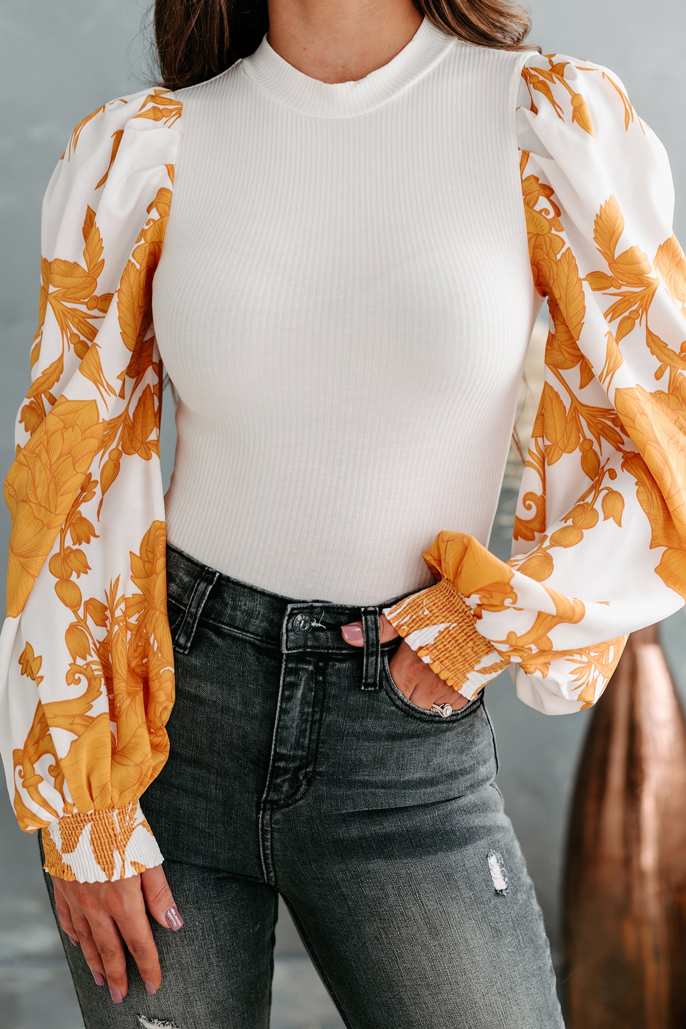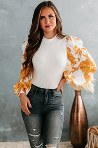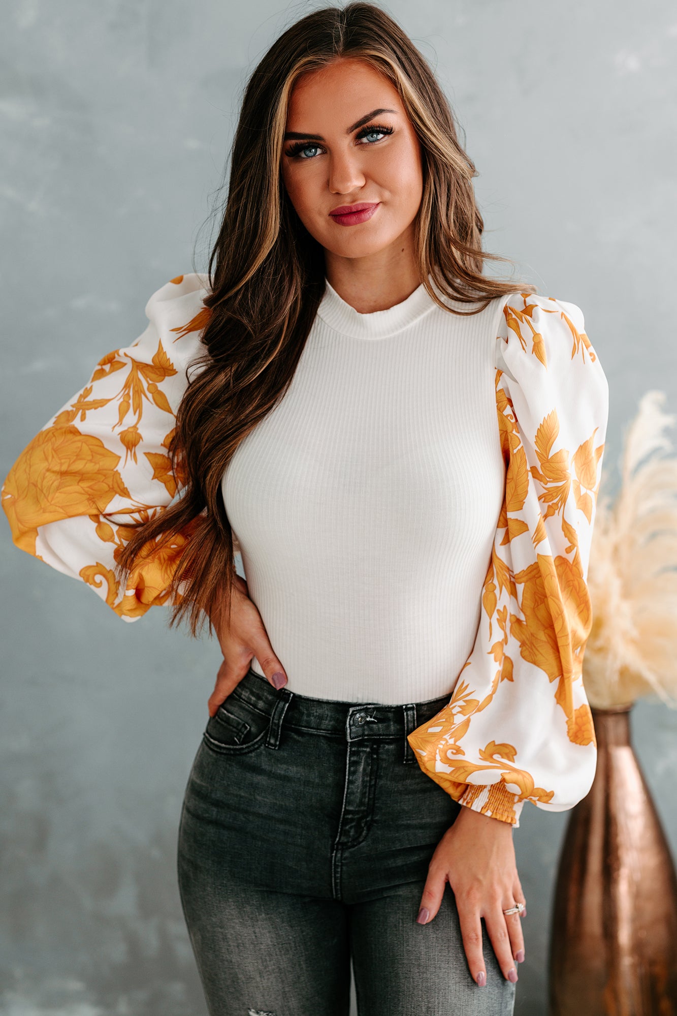 Make A Statement With This Off White, Mock Neck, Ribbed Bodysuit With Puffed, Floral Sleeves!