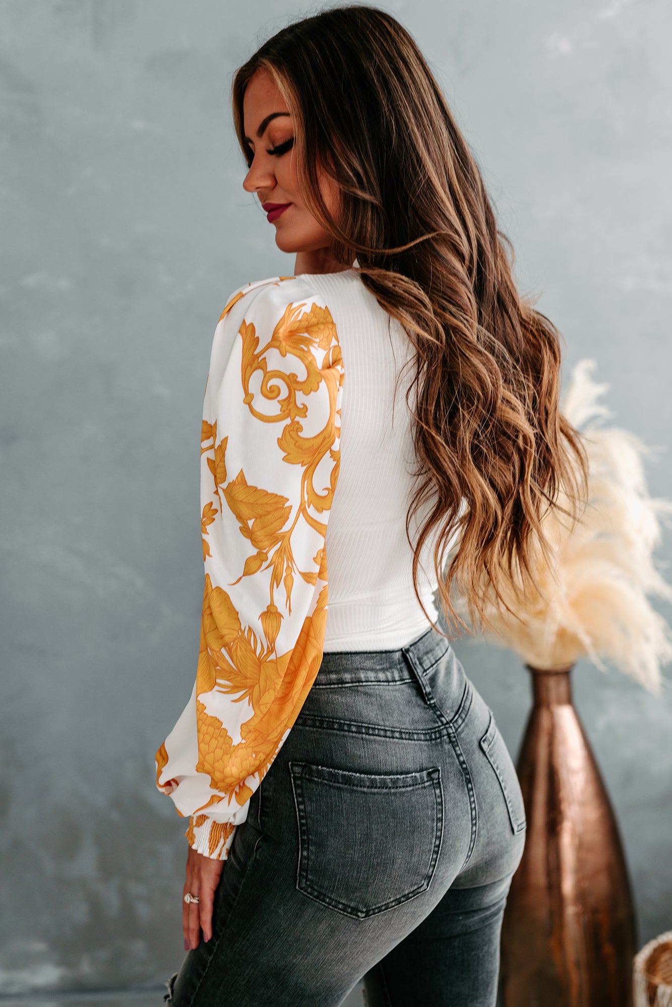 Runway Royalty Ribbed Floral Sleeve Bodysuit (Off White) - NanaMacs