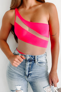 Self Expression One Shoulder Mesh Panel Bodysuit (Neon Fuchsia/Nude)