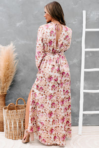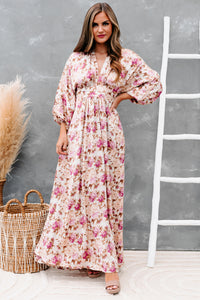 Serene Queen Satin Floral Maxi Dress (Beige/Mauve)