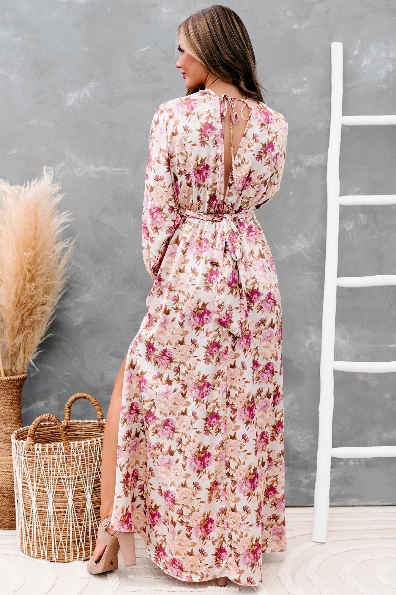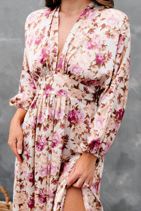 Hold On To Your Hats & Umbrellas Because This Beige/Mauve, Satin, Floral Maxi Dress Is Going To Blow Your Socks Off!