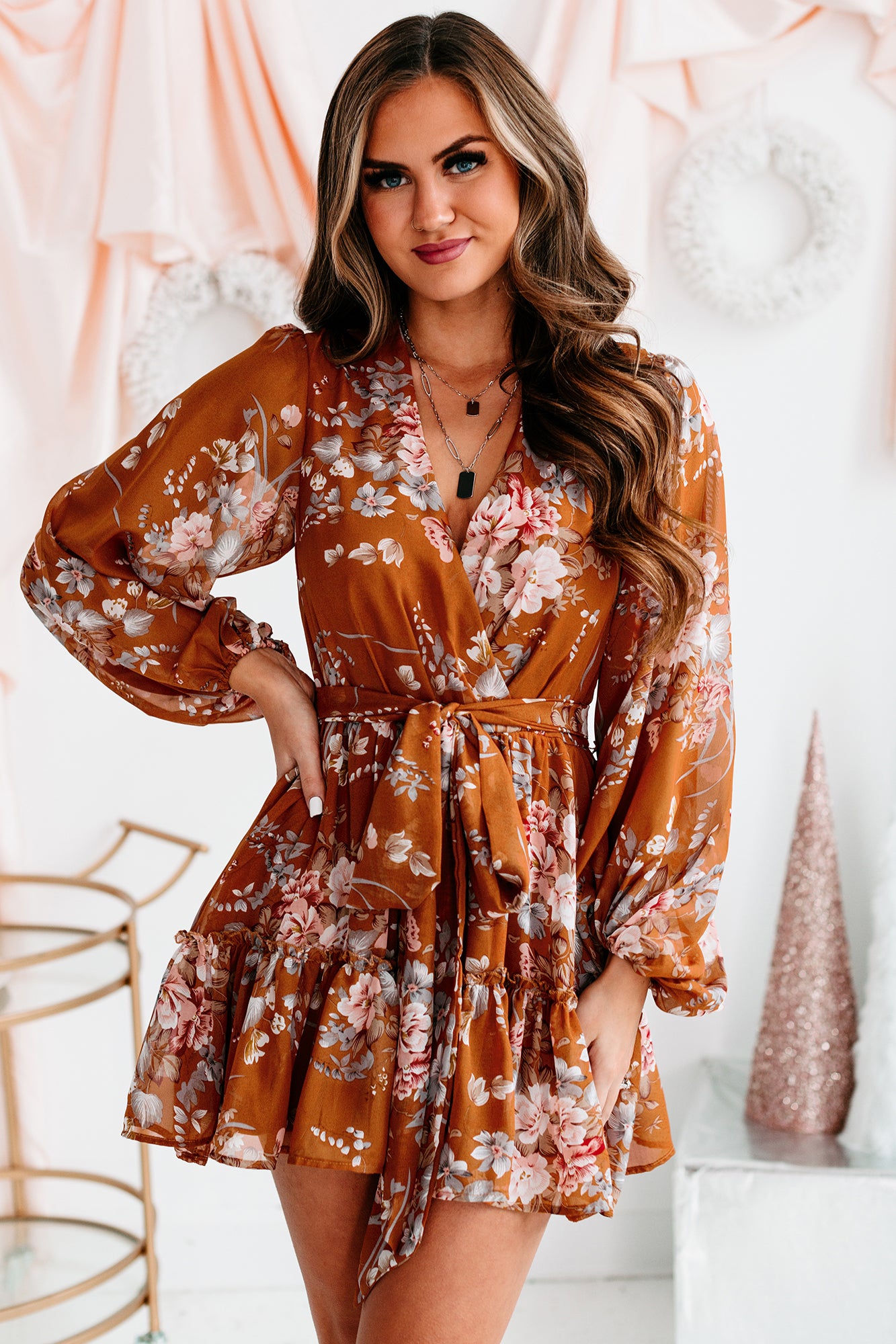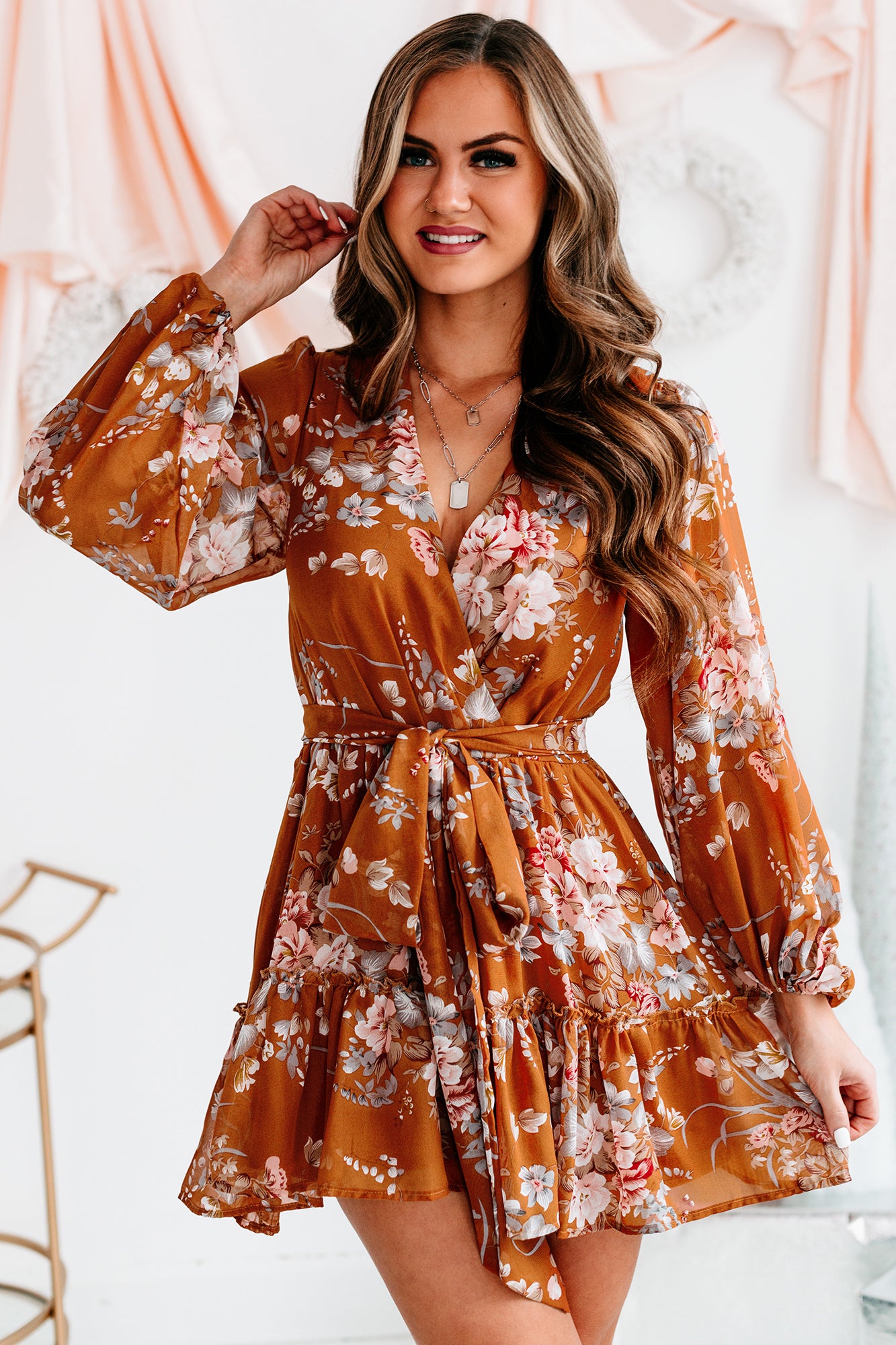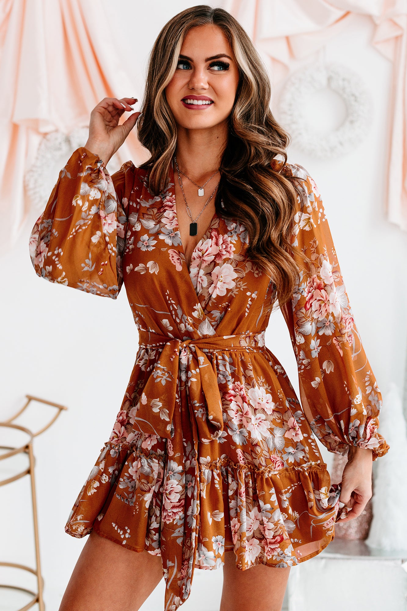 Simply Flourishing Long Sleeve Floral Mini Dress (Rust) - NanaMacs