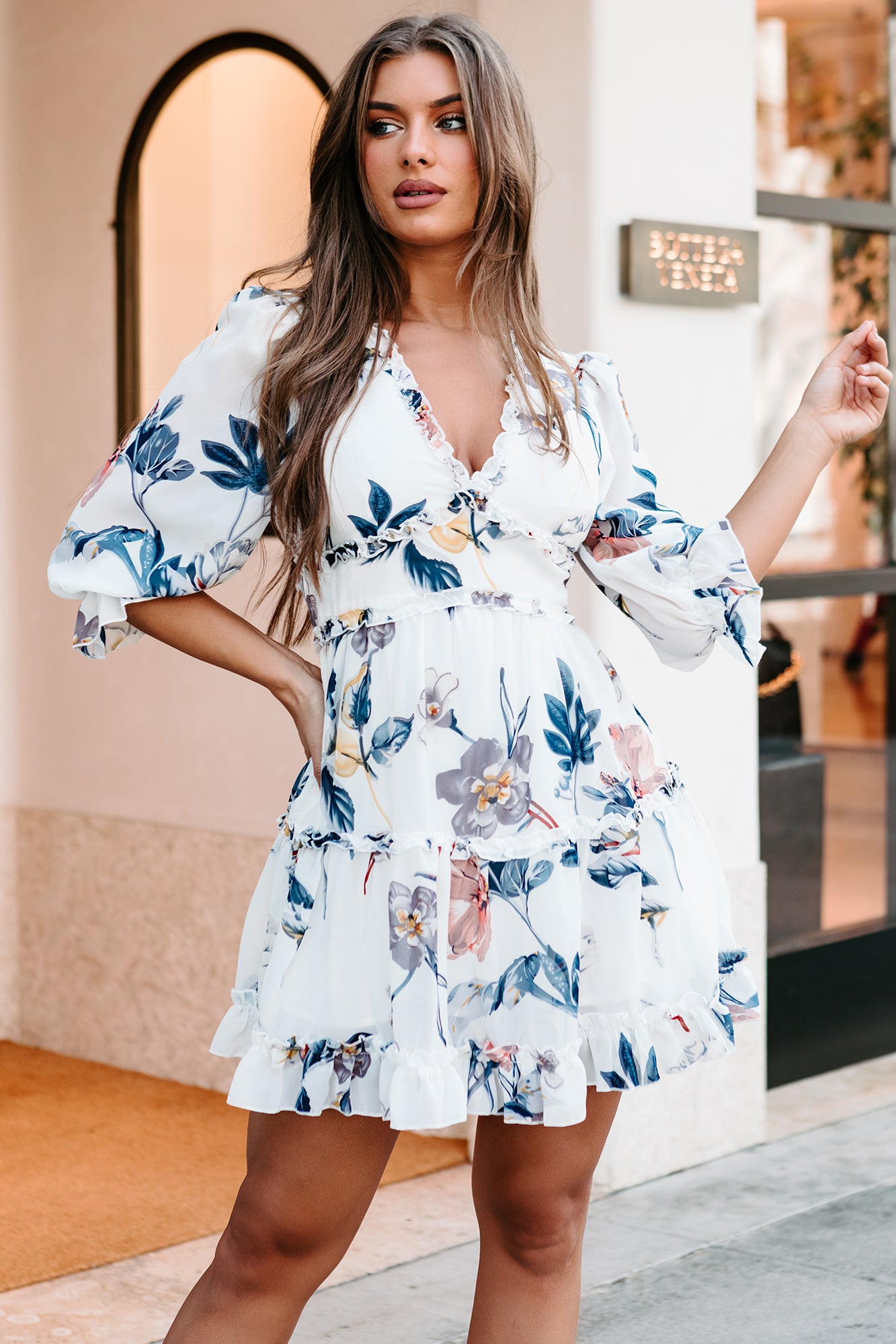 It's inevitable... everyone will be asking about this gorgeous off-white chiffon dress, with a sweet floral design and open back!
