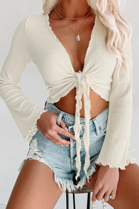 This oat-colored cardigan top is ready to make a statement with its open front and tie detail, finished off with lettuce hem for an added touch of style.