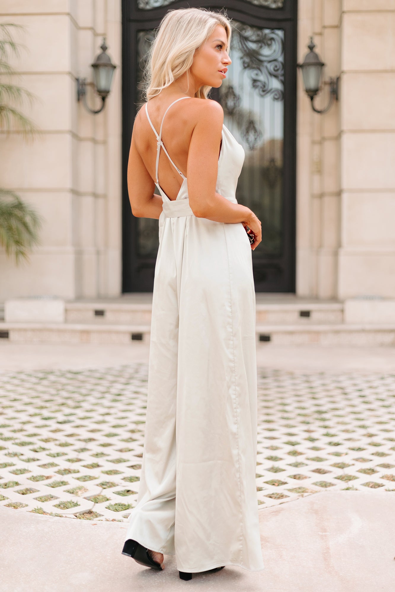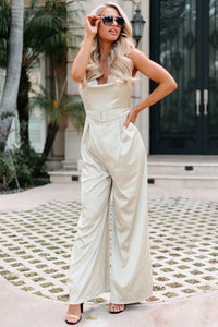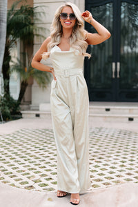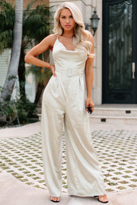 Dress To Impress With This Champagne, Satin, Cowl Neck, Cross-Strap, Belted, Wide Leg Jumpsuit!