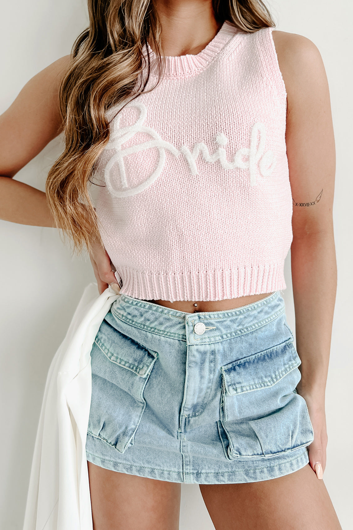 Check out this adorable sleeveless pink sweater! It's made of a cozy knit material, perfect for staying comfy on those cooler days. And the best part? It features a cute "Bride" graphic knit right into it. The slightly cropped length gives it a trendy touch. Don't miss out on this must-have piece for any blushing bride-to-be!