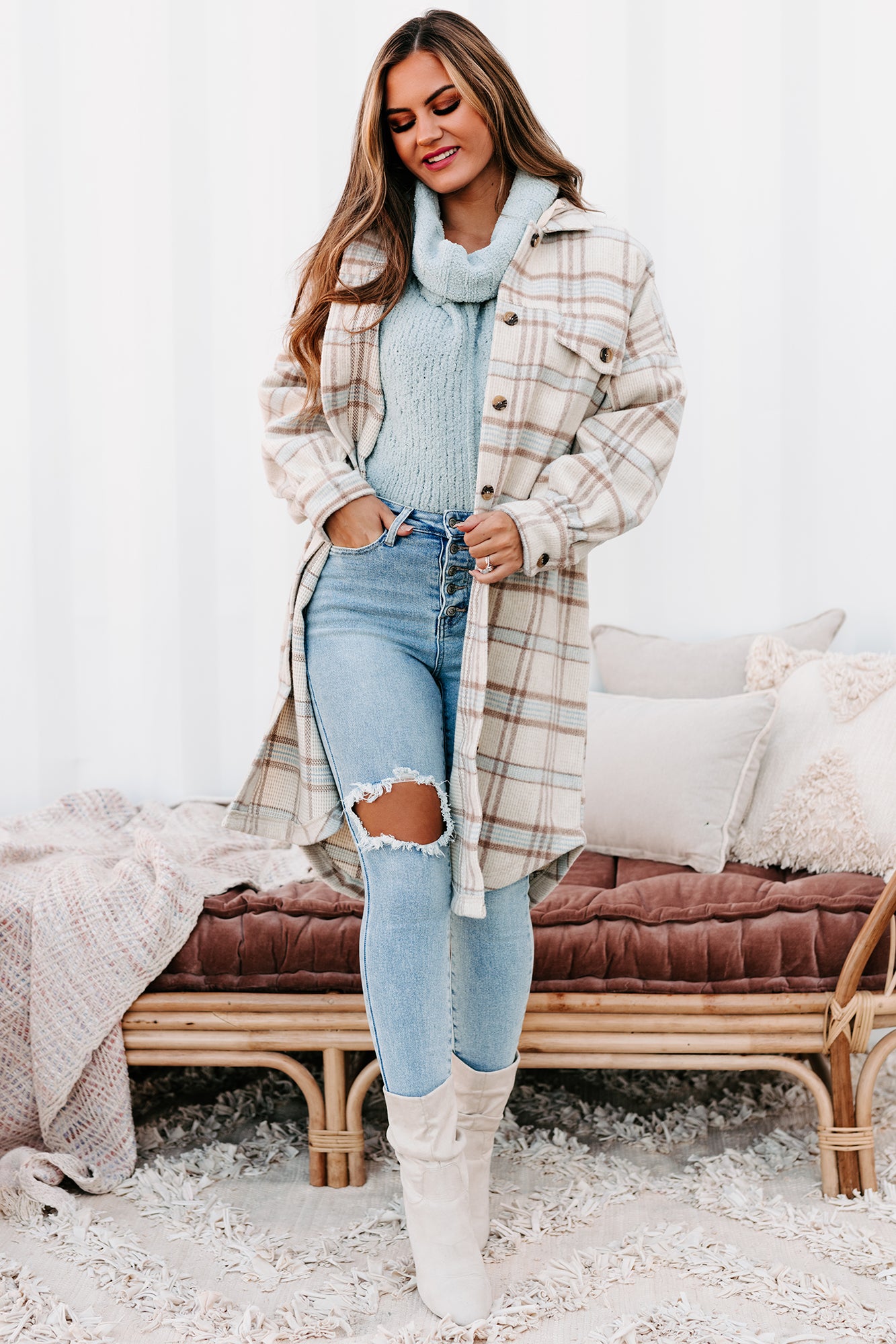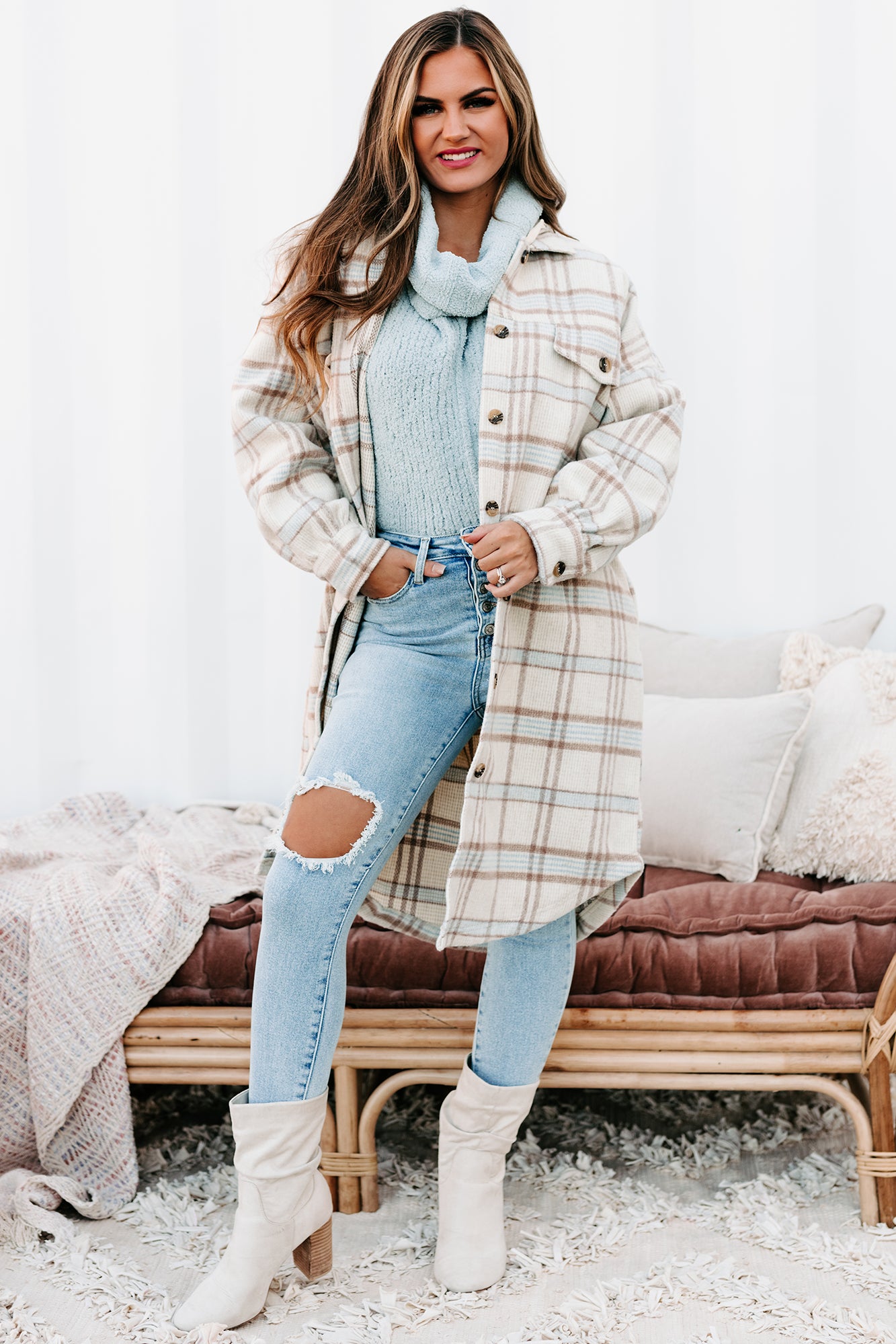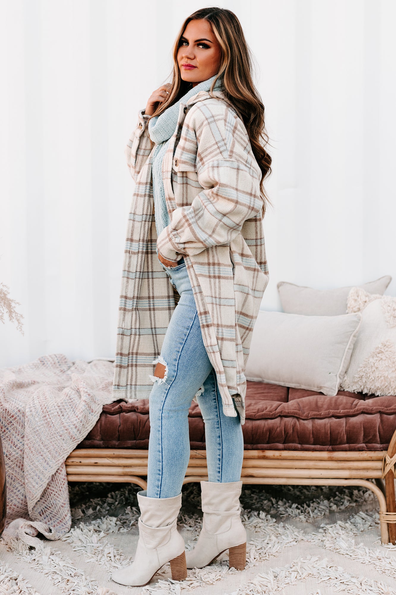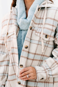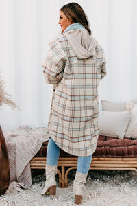 Stay On-Trend With This Cream & Brown, Hooded, Long Plaid Jacket!