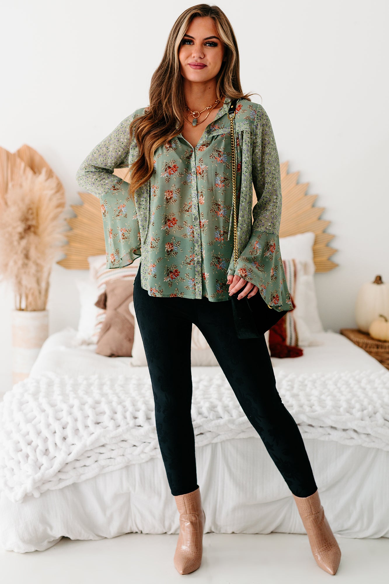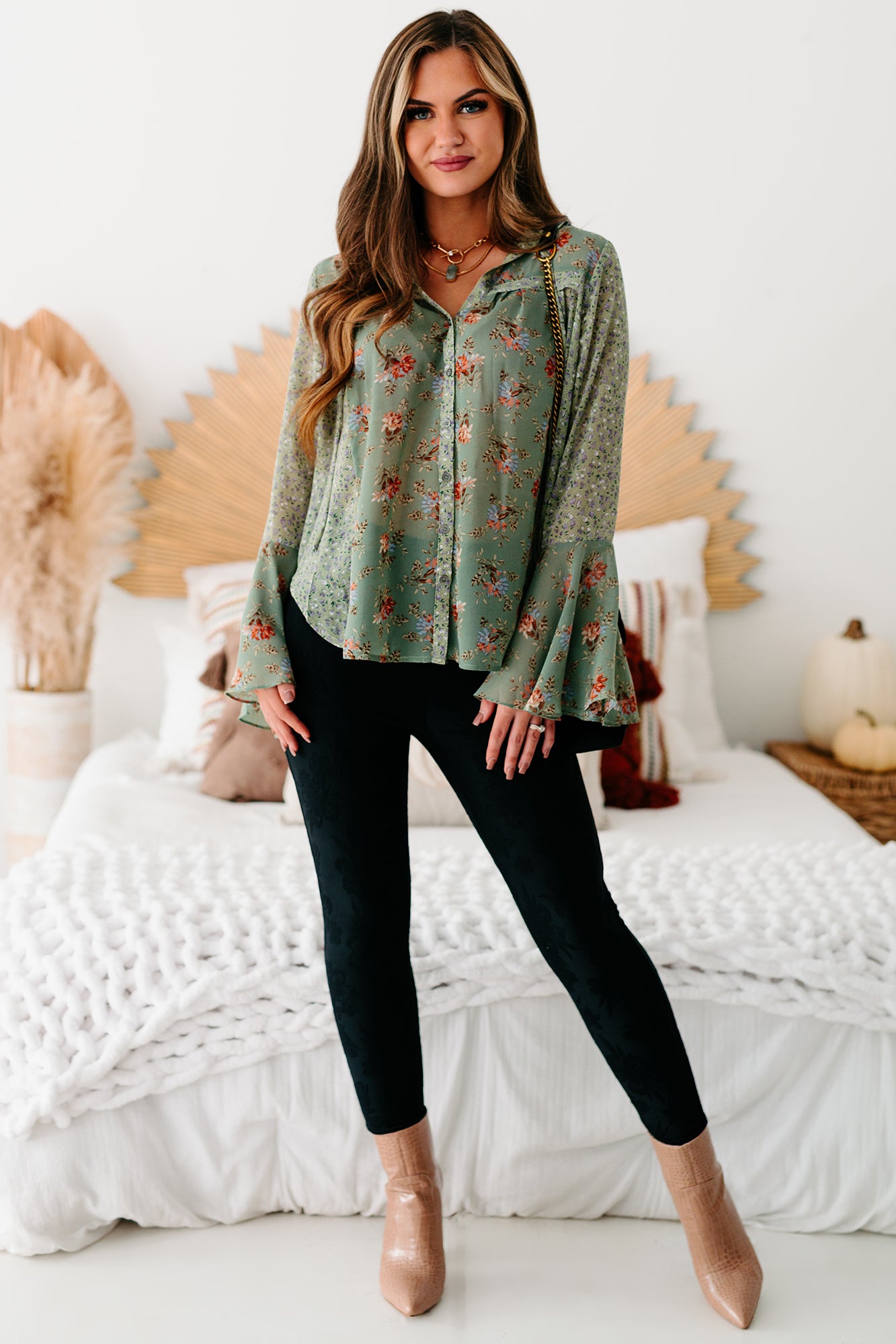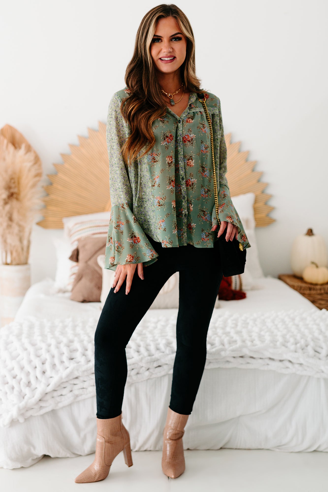 This Sage Floral, Bell Sleeve Top Is Perfect For Dressing Up!