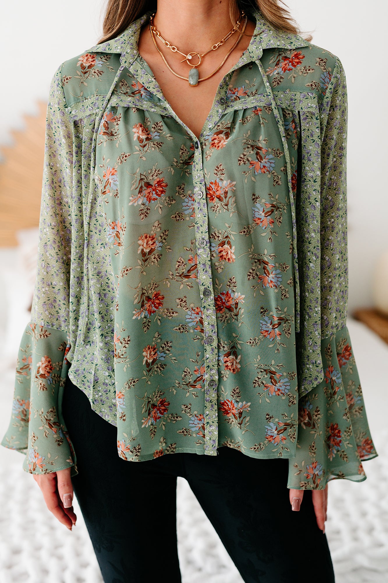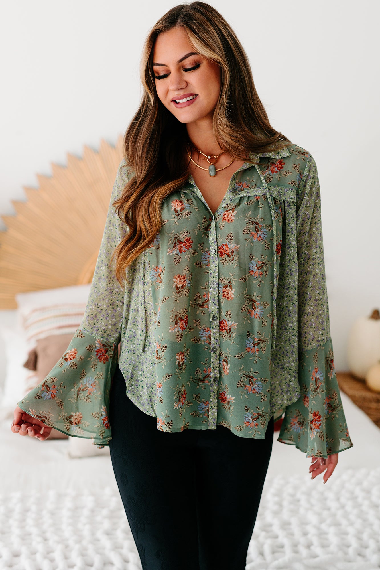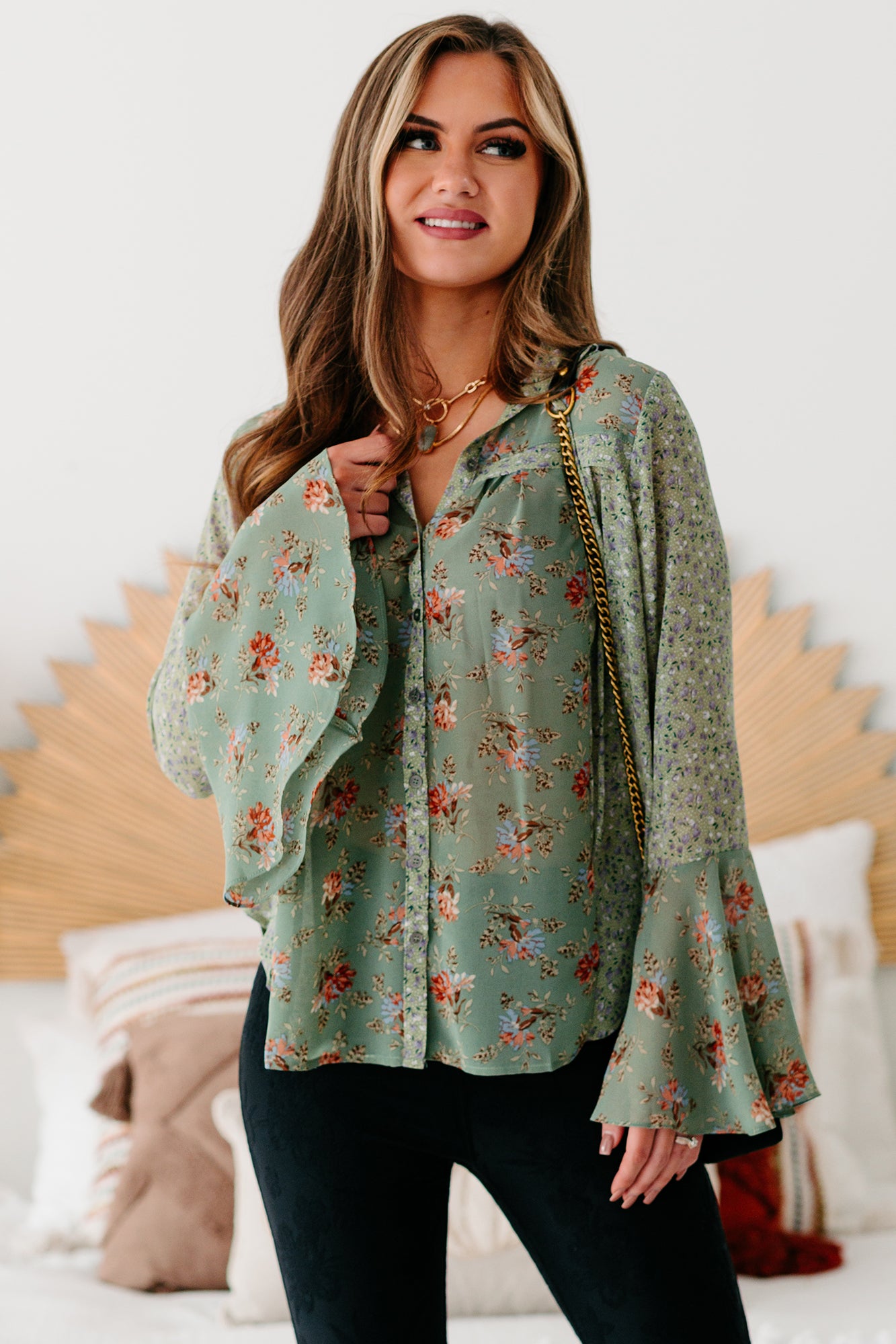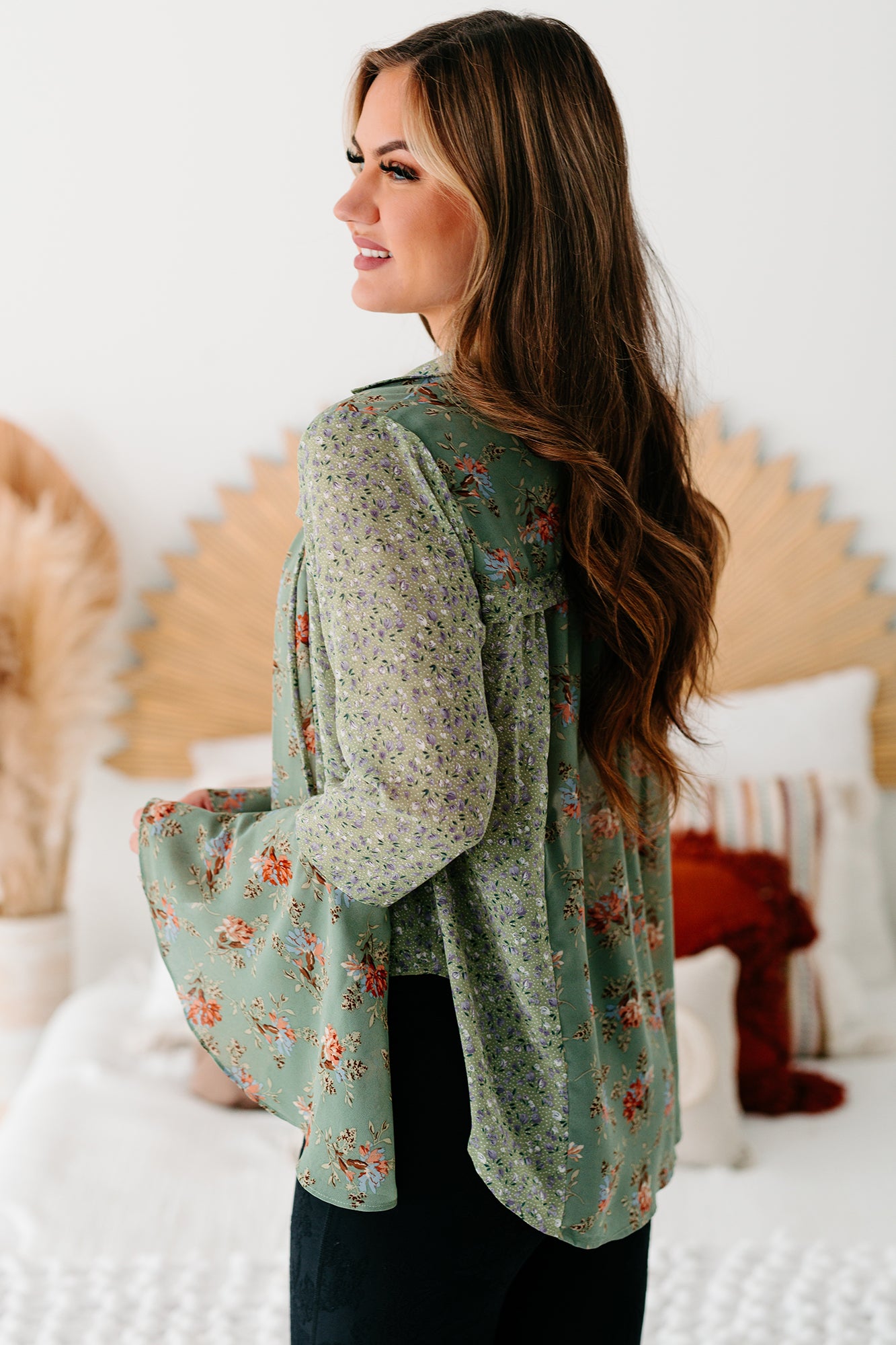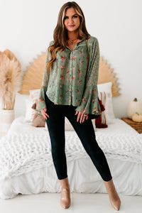 Southern Cities Floral Bell Sleeve Top (Sage Combo)