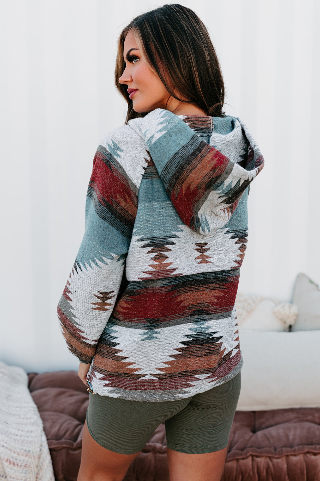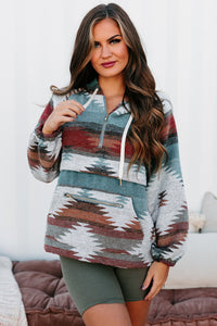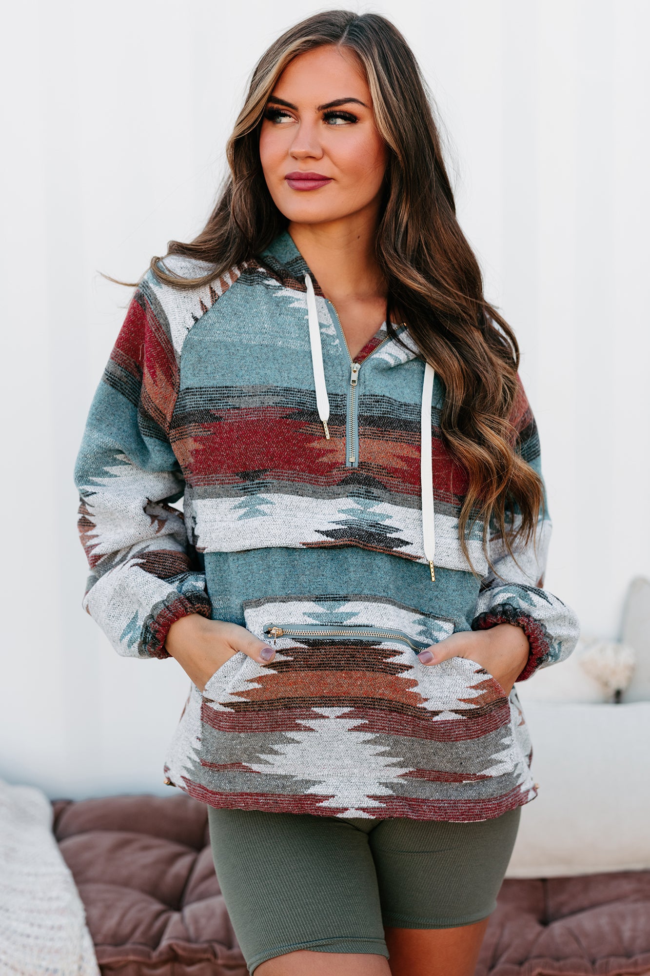 Stay Warm While Looking Cute This Fall In This Teal Multi, Aztec Print, Quarter-Zip Hoodie!