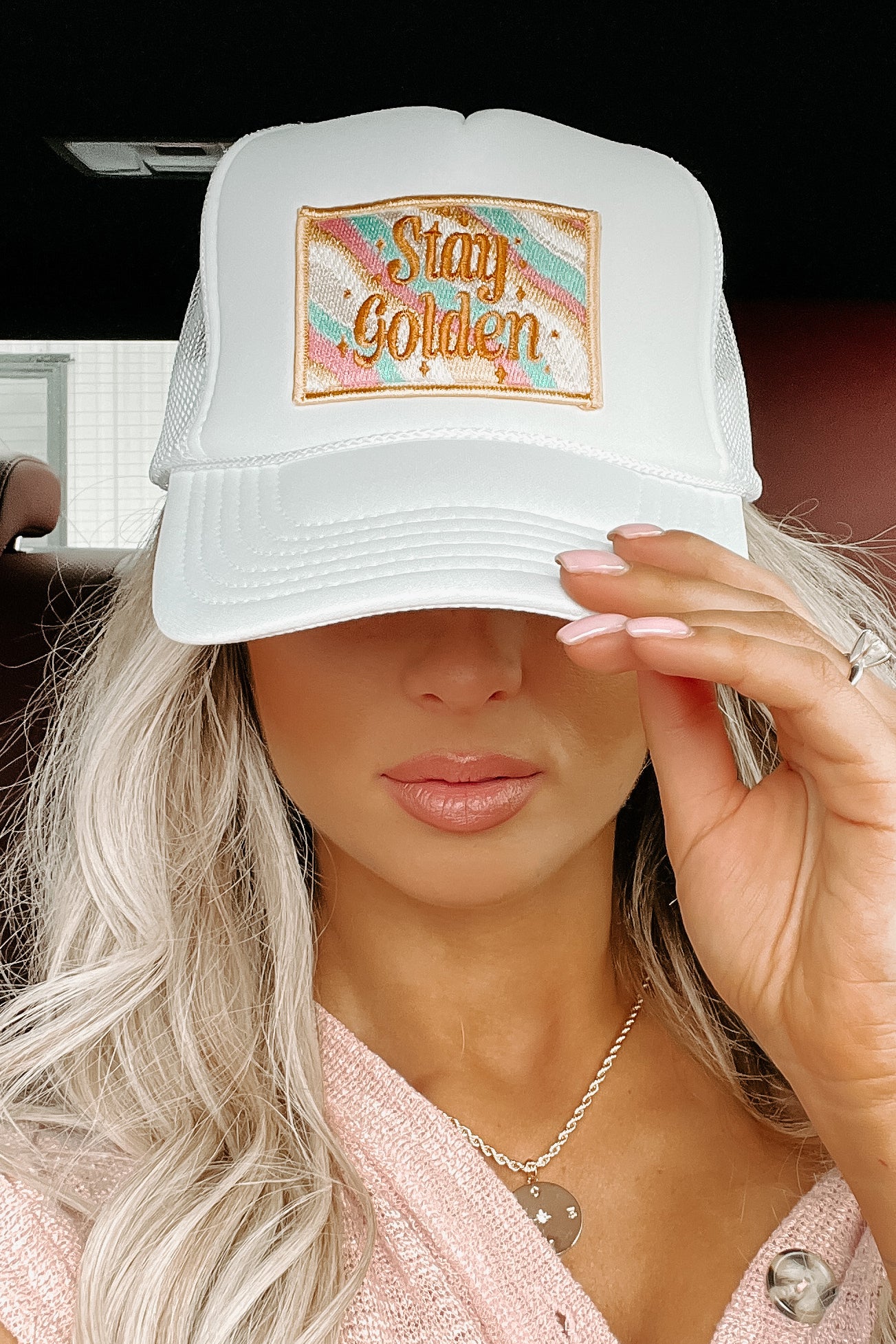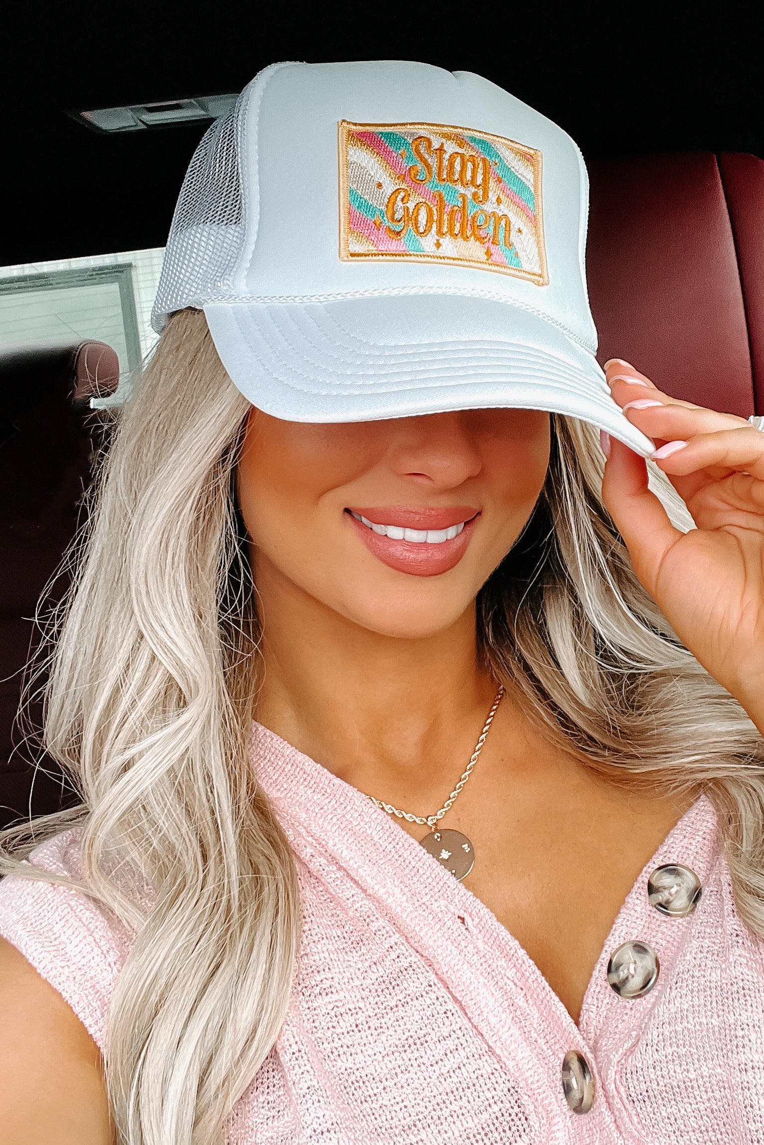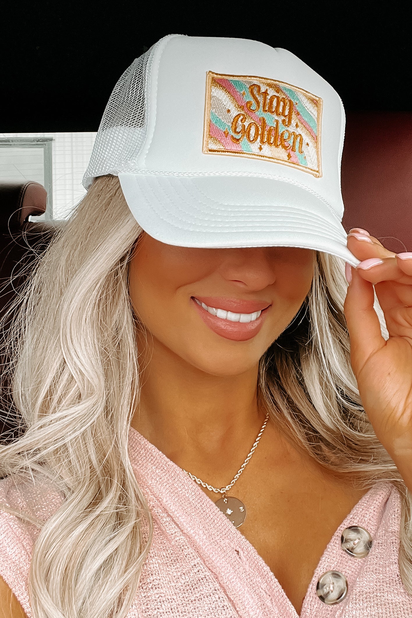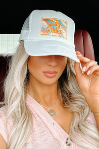 We're Loving The Throw-Back Vibes Of This White, Foam Trucker Hat! The "Stay Golden" Patch Is So Cute!