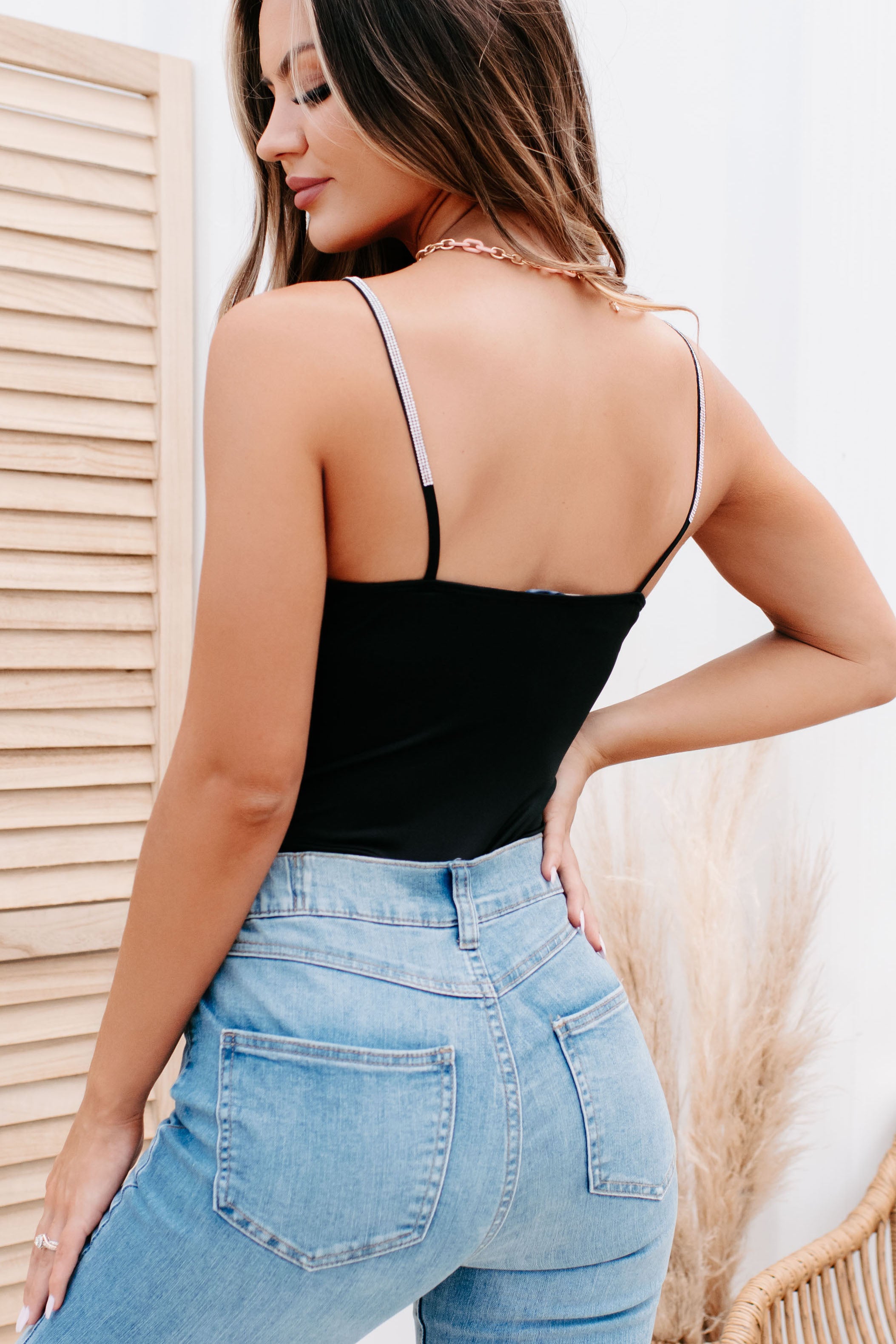 Staying Downtown Rhinestone Strap Bodysuit (Black) - NanaMacs