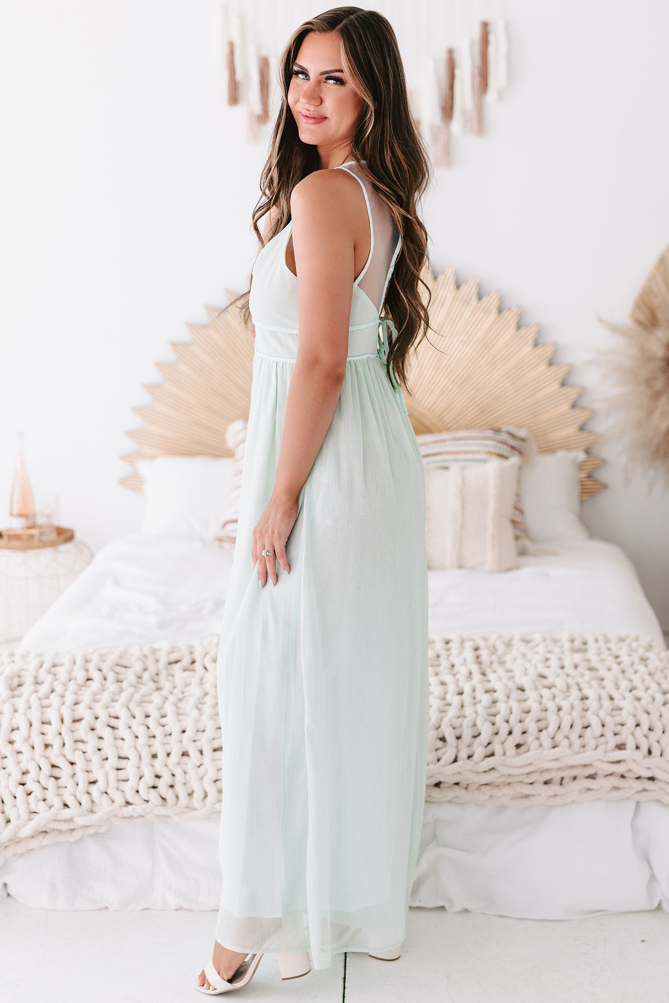Look & Feel Fabulous In This Mint, Glittered Organza, Sleeveless, Keyhole Back, Wide Leg Jumpsuit!